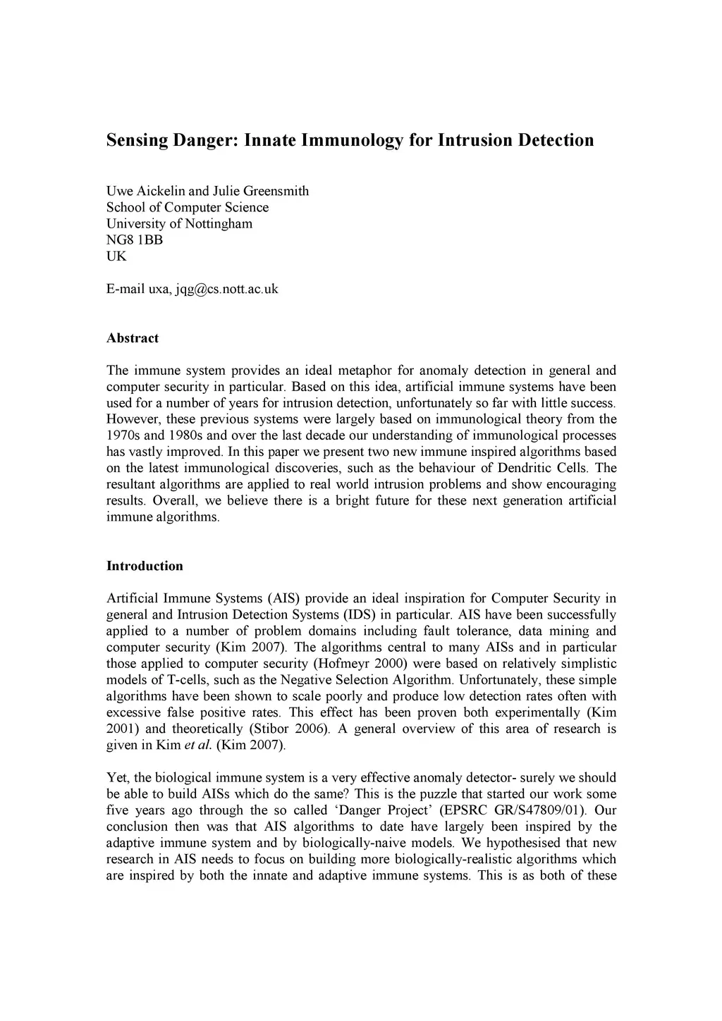 Sensing Danger: Innate Immunology for Intrusion Detection