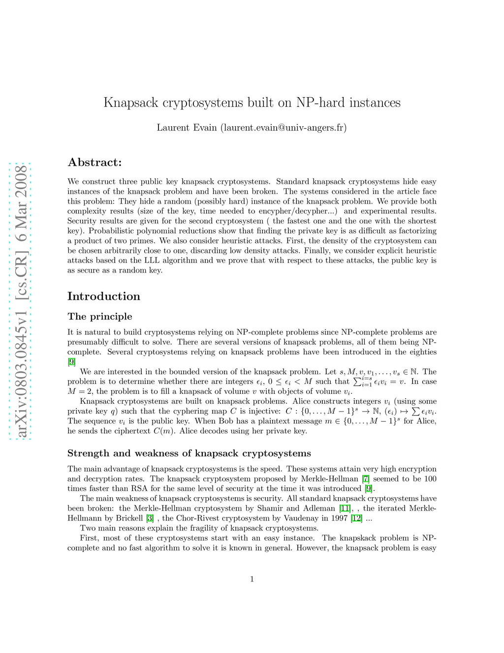Knapsack cryptosystems built on NP-hard instance