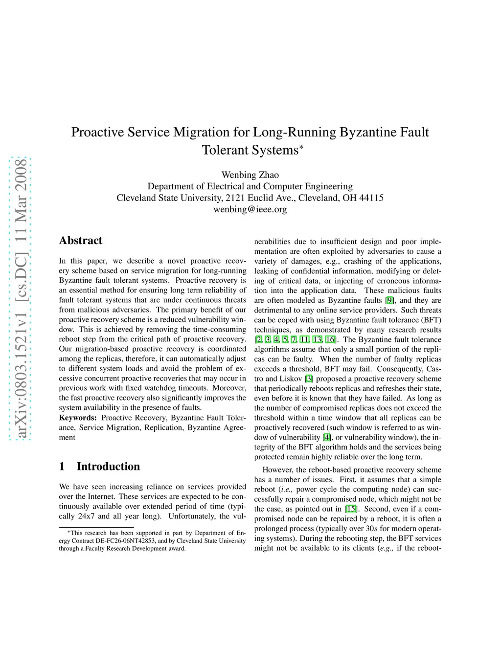 In this paper, we describe a novel proactive recovery scheme based on service migration for long-running Byzantine fault tolerant systems. Proactive recovery is an essential method for ensuring long term reliability of fault tolerant systems that are under continuous threats from malicious adversaries. The primary benefit of our proactive recovery scheme is a reduced vulnerability window. This is achieved by removing the time-consuming reboot step from the critical path of proactive recovery. Our migration-based proactive recovery is coordinated among the replicas, therefore, it can automatically adjust to different system loads and avoid the problem of excessive concurrent proactive recoveries that may occur in previous work with fixed watchdog timeouts. Moreover, the fast proactive recovery also significantly improves the system availability in the presence of faults.