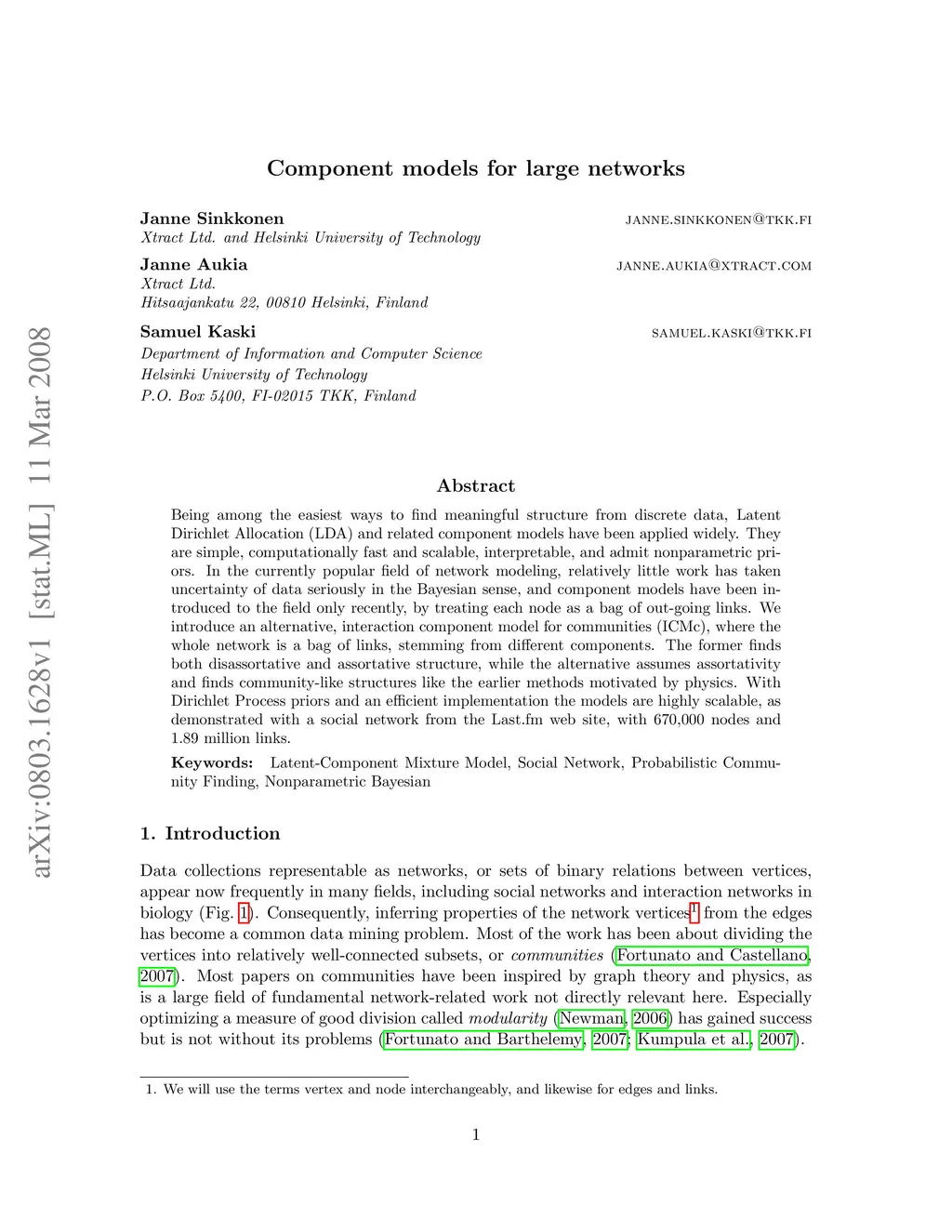 Being among the easiest ways to find meaningful structure from discrete data, Latent Dirichlet Allocation (LDA) and related component models have been applied widely. They are simple, computationally fast and scalable, interpretable, and admit nonparametric priors. In the currently popular field of network modeling, relatively little work has taken uncertainty of data seriously in the Bayesian sense, and component models have been introduced to the field only recently, by treating each node as a bag of out-going links. We introduce an alternative, interaction component model for communities (ICMc), where the whole network is a bag of links, stemming from different components. The former finds both disassortative and assortative structure, while the alternative assumes assortativity and finds community-like structures like the earlier methods motivated by physics. With Dirichlet Process priors and an efficient implementation the models are highly scalable, as demonstrated with a social network from the Last.fm web site, with 670,000 nodes and 1.89 million links.