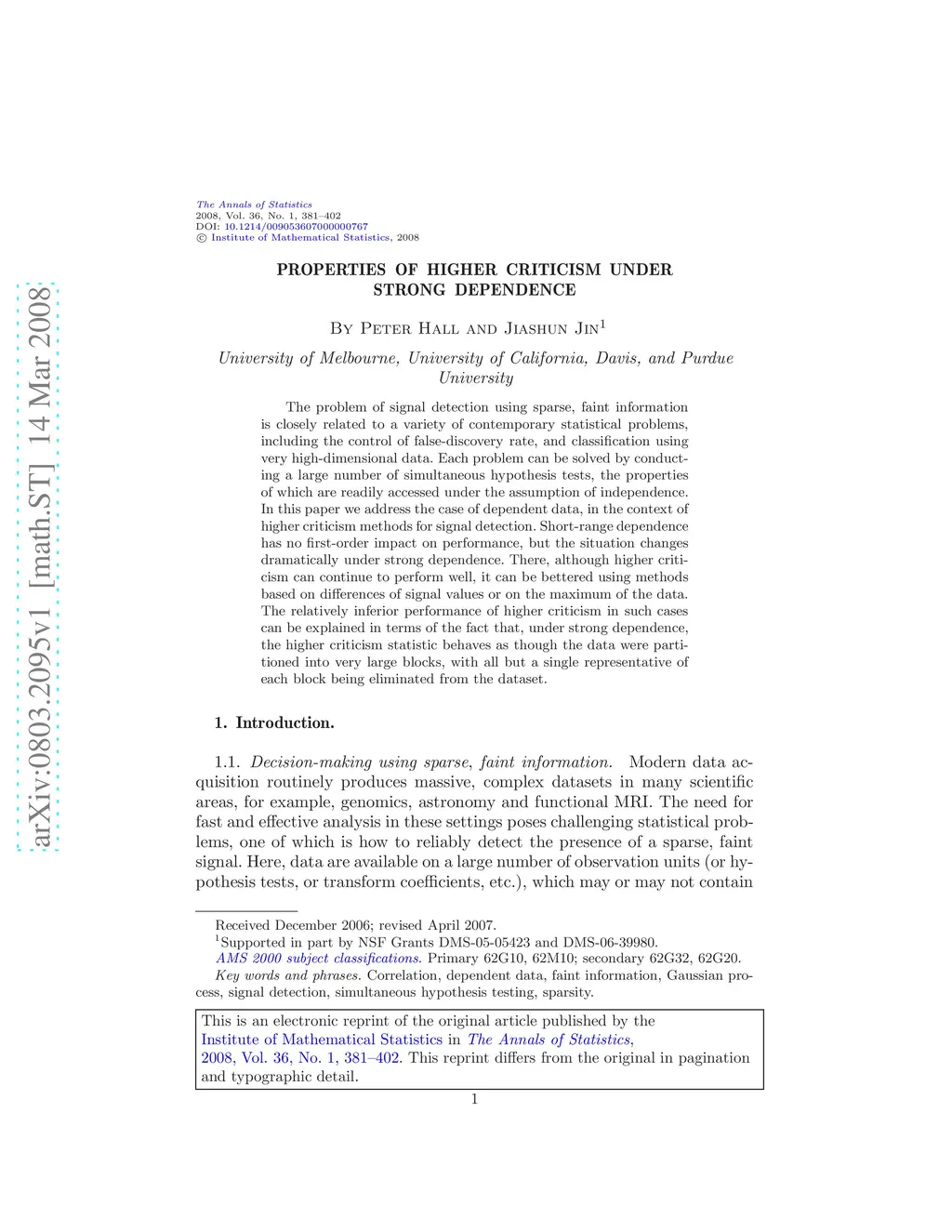 The problem of signal detection using sparse, faint information is closely related to a variety of contemporary statistical problems, including the control of false-discovery rate, and classification using very high-dimensional data. Each problem can be solved by conducting a large number of simultaneous hypothesis tests, the properties of which are readily accessed under the assumption of independence. In this paper we address the case of dependent data, in the context of higher criticism methods for signal detection. Short-range dependence has no first-order impact on performance, but the situation changes dramatically under strong dependence. There, although higher criticism can continue to perform well, it can be bettered using methods based on differences of signal values or on the maximum of the data. The relatively inferior performance of higher criticism in such cases can be explained in terms of the fact that, under strong dependence, the higher criticism statistic behaves as though the data were partitioned into very large blocks, with all but a single representative of each block being eliminated from the dataset.