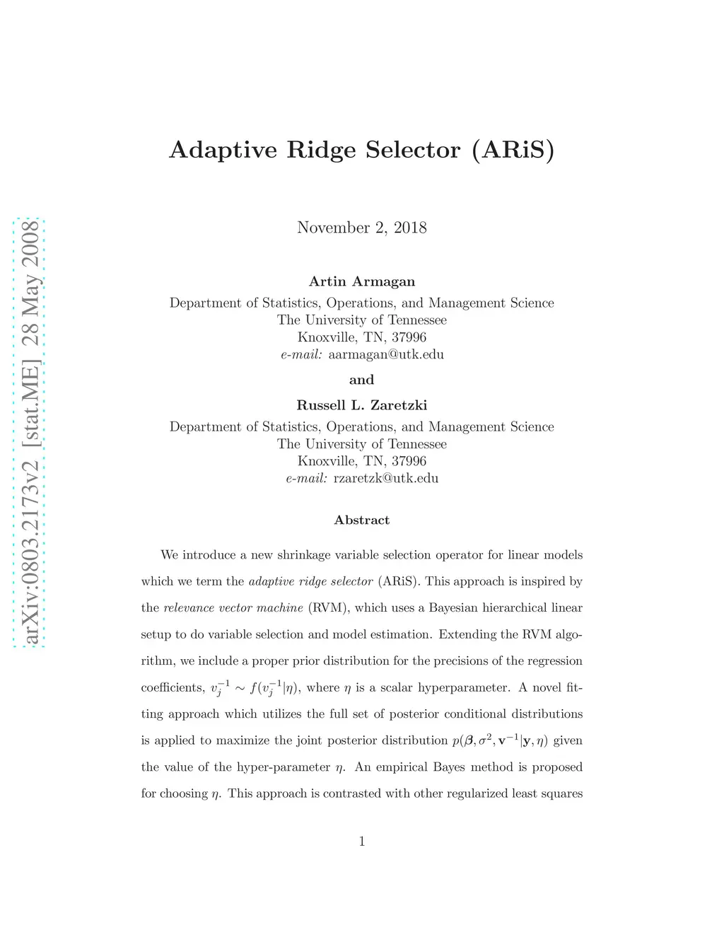 We introduce a new shrinkage variable selection operator for linear models which we term the \emph{adaptive ridge selector} (ARiS). This approach is inspired by the \emph{relevance vector machine} (RVM), which uses a Bayesian hierarchical linear setup to do variable selection and model estimation. Extending the RVM algorithm, we include a proper prior distribution for the precisions of the regression coefficients, , where is a scalar hyperparameter. A novel fitting approach which utilizes the full set of posterior conditional distributions is applied to maximize the joint posterior distribution given the value of the hyper-parameter . An empirical Bayes method is proposed for choosing . This approach is contrasted with other regularized least squares estimators including the lasso, its variants, nonnegative garrote and ordinary ridge regression. Performance differences are explored for various simulated data examples. Results indicate superior prediction and model selection accuracy under sparse setups and drastic improvement in accuracy of model choice with increasing sample size.
