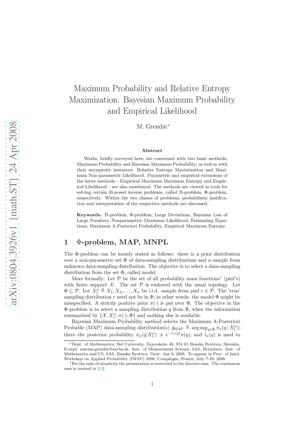 Works, briefly surveyed here, are concerned with two basic methods: Maximum Probability and Bayesian Maximum Probability; as well as with their asymptotic instances: Relative Entropy Maximization and Maximum Non-parametric Likelihood. Parametric and empirical extensions of the latter methods - Empirical Maximum Maximum Entropy and Empirical Likelihood - are also mentioned. The methods are viewed as tools for solving certain ill-posed inverse problems, called Pi-problem, Phi-problem, respectively. Within the two classes of problems, probabilistic justification and interpretation of the respective methods are discussed.