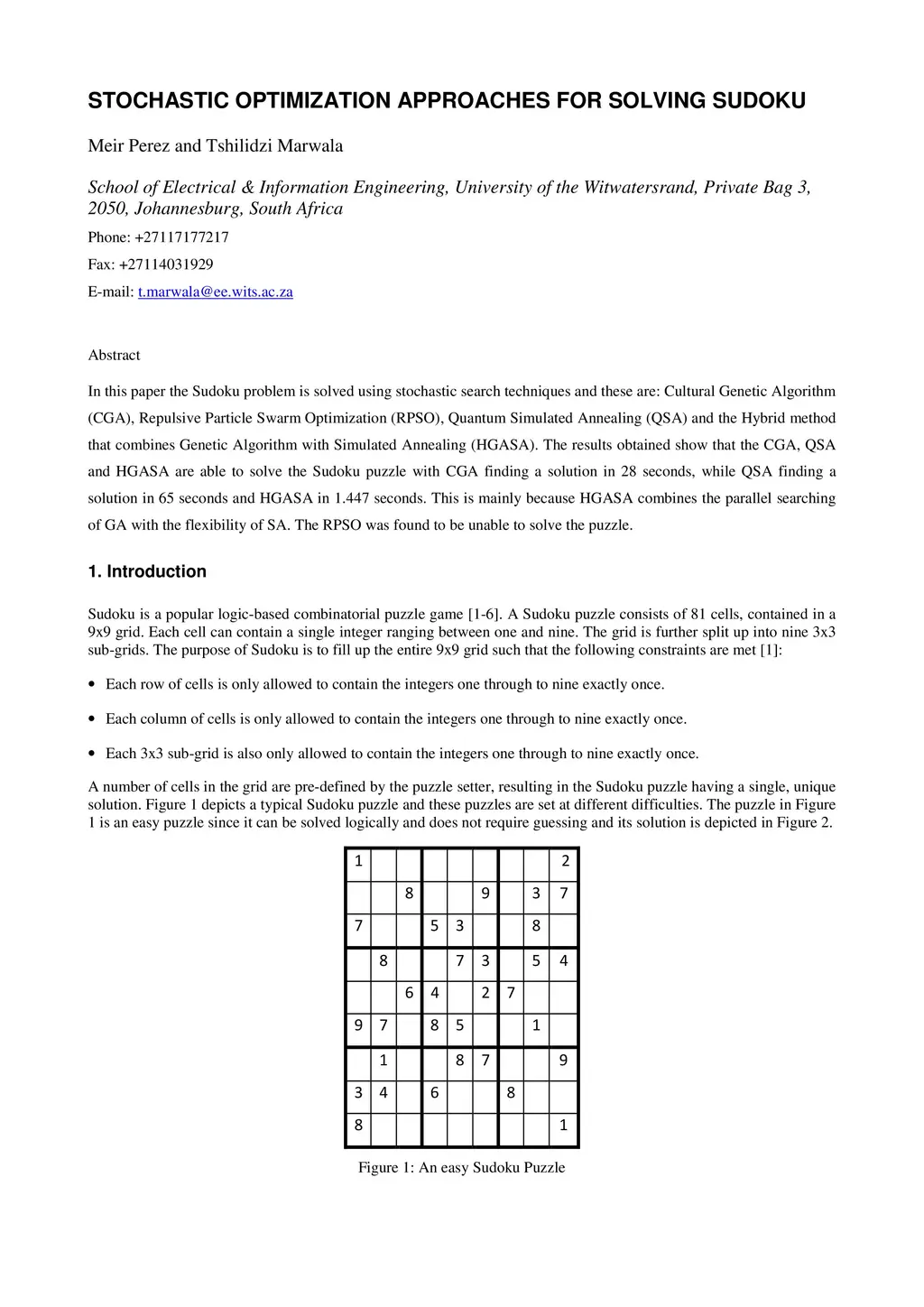 In this paper the Sudoku problem is solved using stochastic search techniques and these are: Cultural Genetic Algorithm (CGA), Repulsive Particle Swarm Optimization (RPSO), Quantum Simulated Annealing (QSA) and the Hybrid method that combines Genetic Algorithm with Simulated Annealing (HGASA). The results obtained show that the CGA, QSA and HGASA are able to solve the Sudoku puzzle with CGA finding a solution in 28 seconds, while QSA finding a solution in 65 seconds and HGASA in 1.447 seconds. This is mainly because HGASA combines the parallel searching of GA with the flexibility of SA. The RPSO was found to be unable to solve the puzzle.