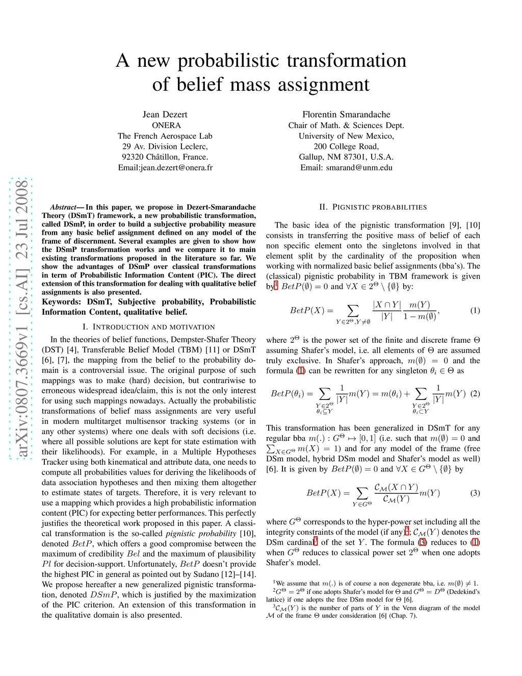 In this paper, we propose in Dezert-Smarandache Theory (DSmT) framework, a new probabilistic transformation, called DSmP, in order to build a subjective probability measure from any basic belief assignment defined on any model of the frame of discernment. Several examples are given to show how the DSmP transformation works and we compare it to main existing transformations proposed in the literature so far. We show the advantages of DSmP over classical transformations in term of Probabilistic Information Content (PIC). The direct extension of this transformation for dealing with qualitative belief assignments is also presented.
