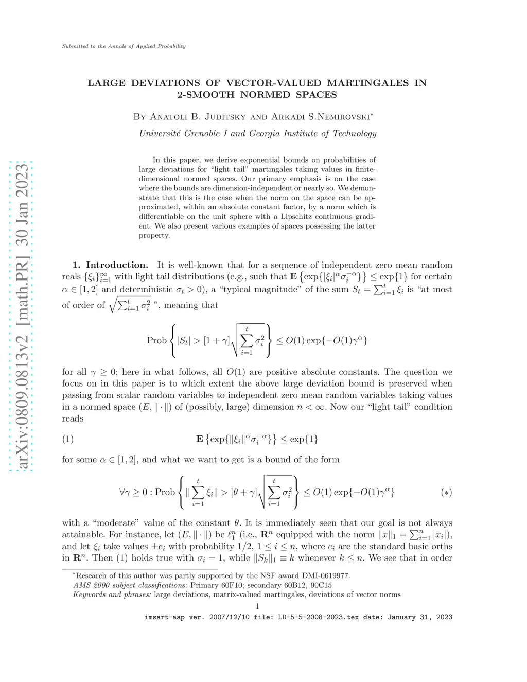 We derive exponential bounds on probabilities of large deviations for "light tail" martingales taking values in finite-dimensional normed spaces. Our primary emphasis is on the case where the bounds are dimension-independent or nearly so. We demonstrate that this is the case when the norm on the space can be approximated, within an absolute constant factor, by a norm which is differentiable on the unit sphere with a Lipschitz continuous gradient. We also present various examples of spaces possessing the latter property.