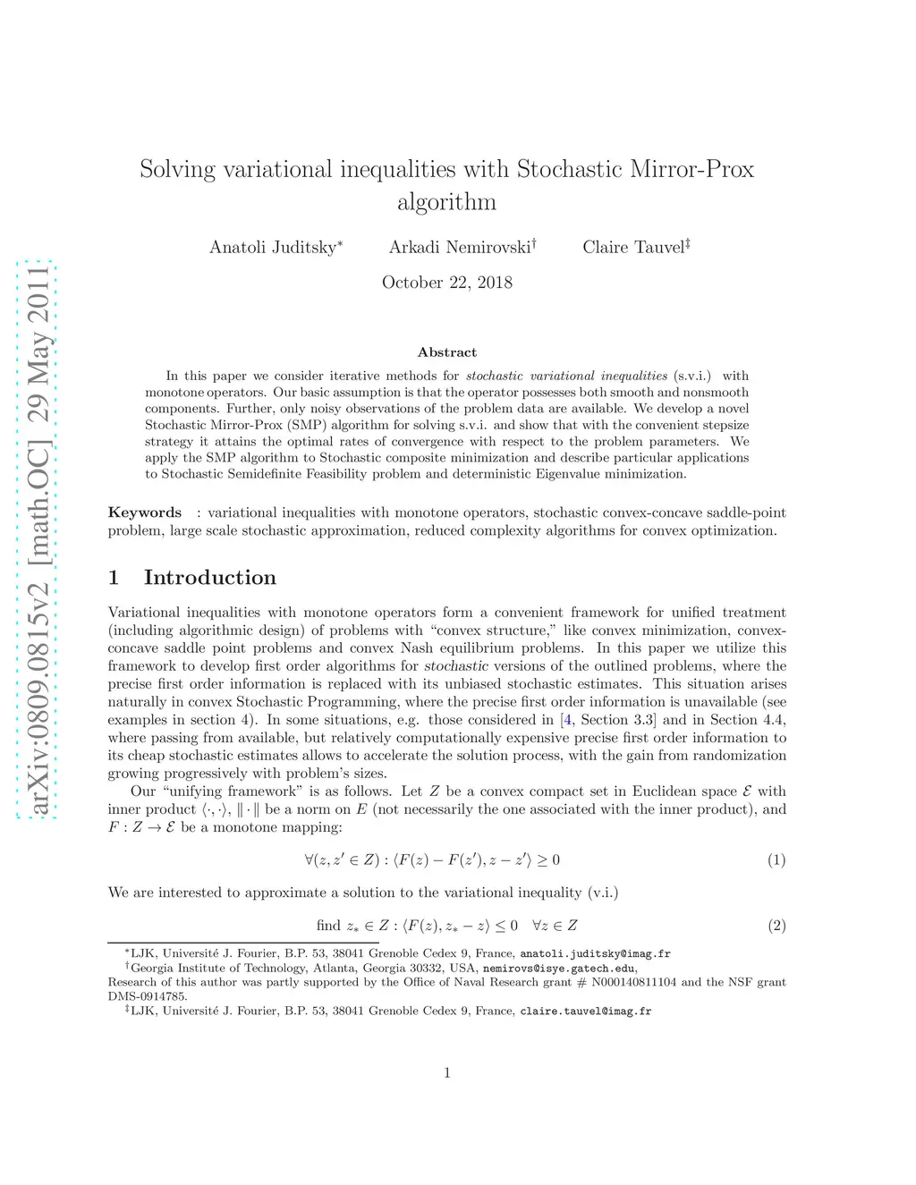 In this paper we consider iterative methods for stochastic variational inequalities (s.v.i.) with monotone operators. Our basic assumption is that the operator possesses both smooth and nonsmooth components. Further, only noisy observations of the problem data are available. We develop a novel Stochastic Mirror-Prox (SMP) algorithm for solving s.v.i. and show that with the convenient stepsize strategy it attains the optimal rates of convergence with respect to the problem parameters. We apply the SMP algorithm to Stochastic composite minimization and describe particular applications to Stochastic Semidefinite Feasability problem and Eigenvalue minimization.