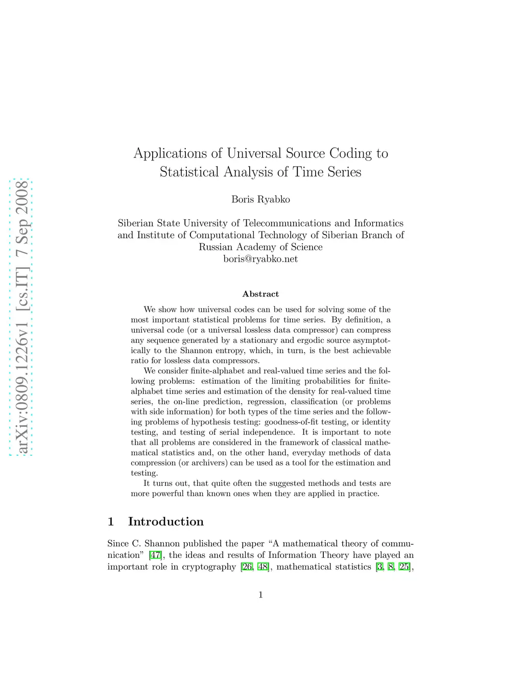 We show how universal codes can be used for solving some of the most important statistical problems for time series. By definition, a universal code (or a universal lossless data compressor) can compress any sequence generated by a stationary and ergodic source asymptotically to the Shannon entropy, which, in turn, is the best achievable ratio for lossless data compressors. We consider finite-alphabet and real-valued time series and the following problems: estimation of the limiting probabilities for finite-alphabet time series and estimation of the density for real-valued time series, the on-line prediction, regression, classification (or problems with side information) for both types of the time series and the following problems of hypothesis testing: goodness-of-fit testing, or identity testing, and testing of serial independence. It is important to note that all problems are considered in the framework of classical mathematical statistics and, on the other hand, everyday methods of data compression (or archivers) can be used as a tool for the estimation and testing. It turns out, that quite often the suggested methods and tests are more powerful than known ones when they are applied in practice.