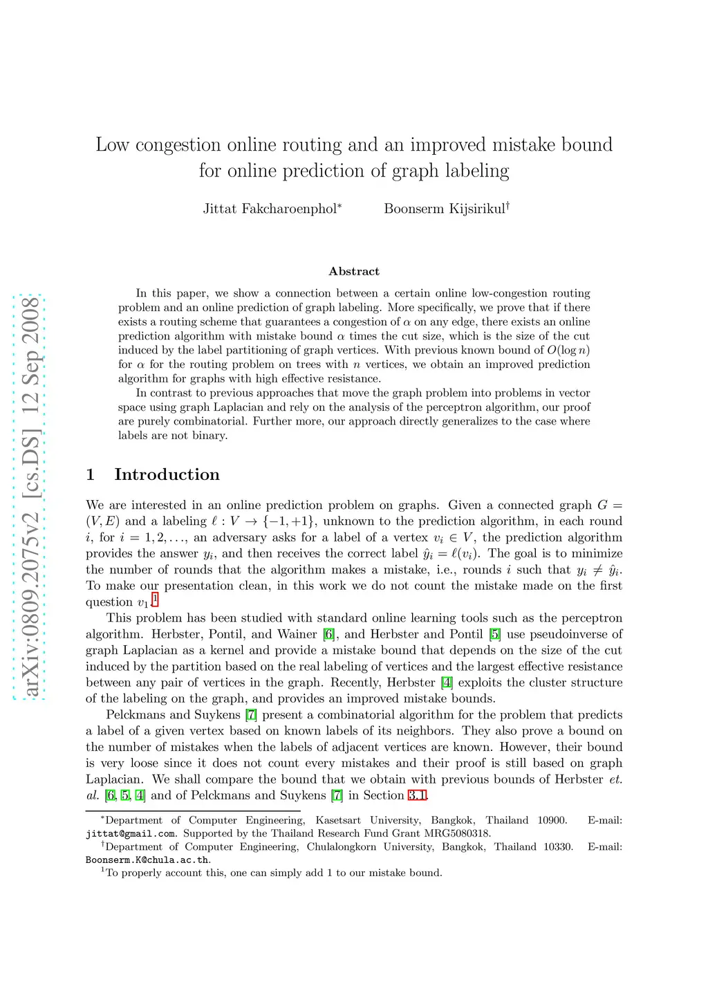 In this paper, we show a connection between a certain online low-congestion routing problem and an online prediction of graph labeling. More specifically, we prove that if there exists a routing scheme that guarantees a congestion of on any edge, there exists an online prediction algorithm with mistake bound times the cut size, which is the size of the cut induced by the label partitioning of graph vertices. With previous known bound of for for the routing problem on trees with vertices, we obtain an improved prediction algorithm for graphs with high effective resistance. In contrast to previous approaches that move the graph problem into problems in vector space using graph Laplacian and rely on the analysis of the perceptron algorithm, our proof are purely combinatorial. Further more, our approach directly generalizes to the case where labels are not binary.