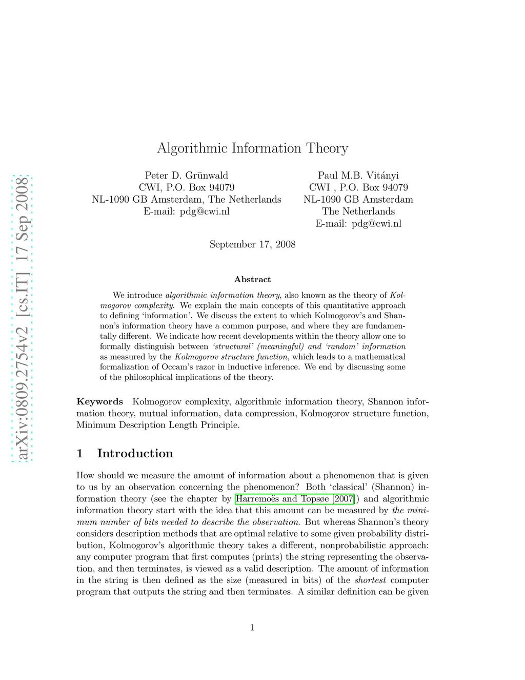 We introduce algorithmic information theory, also known as the theory of Kolmogorov complexity. We explain the main concepts of this quantitative approach to defining `information'. We discuss the extent to which Kolmogorov's and Shannon's information theory have a common purpose, and where they are fundamentally different. We indicate how recent developments within the theory allow one to formally distinguish between `structural' (meaningful) and `random' information as measured by the Kolmogorov structure function, which leads to a mathematical formalization of Occam's razor in inductive inference. We end by discussing some of the philosophical implications of the theory.