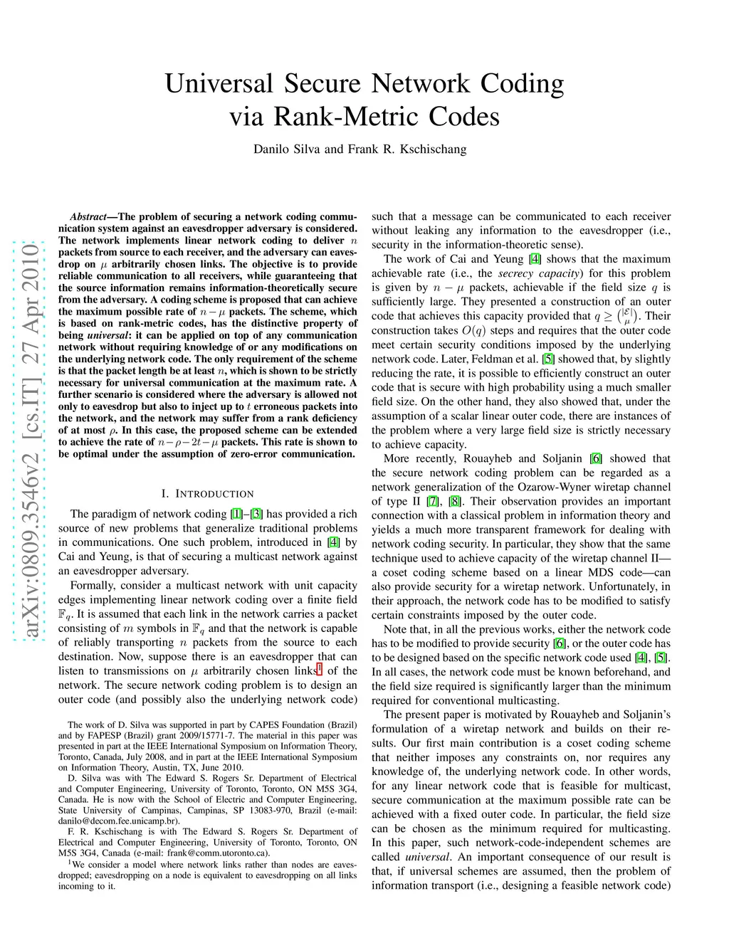 The problem of securing a network coding communication system against an eavesdropper adversary is considered. The network implements linear network coding to deliver n packets from source to each receiver, and the adversary can eavesdrop on \mu arbitrarily chosen links. The objective is to provide reliable communication to all receivers, while guaranteeing that the source information remains information-theoretically secure from the adversary. A coding scheme is proposed that can achieve the maximum possible rate of n-\mu packets. The scheme, which is based on rank-metric codes, has the distinctive property of being universal: it can be applied on top of any communication network without requiring knowledge of or any modifications on the underlying network code. The only requirement of the scheme is that the packet length be at least n, which is shown to be strictly necessary for universal communication at the maximum rate. A further scenario is considered where the adversary is allowed not only to eavesdrop but also to inject up to t erroneous packets into the network, and the network may suffer from a rank deficiency of at most \rho. In this case, the proposed scheme can be extended to achieve the rate of n-\rho-2t-\mu packets. This rate is shown to be optimal under the assumption of zero-error communication.