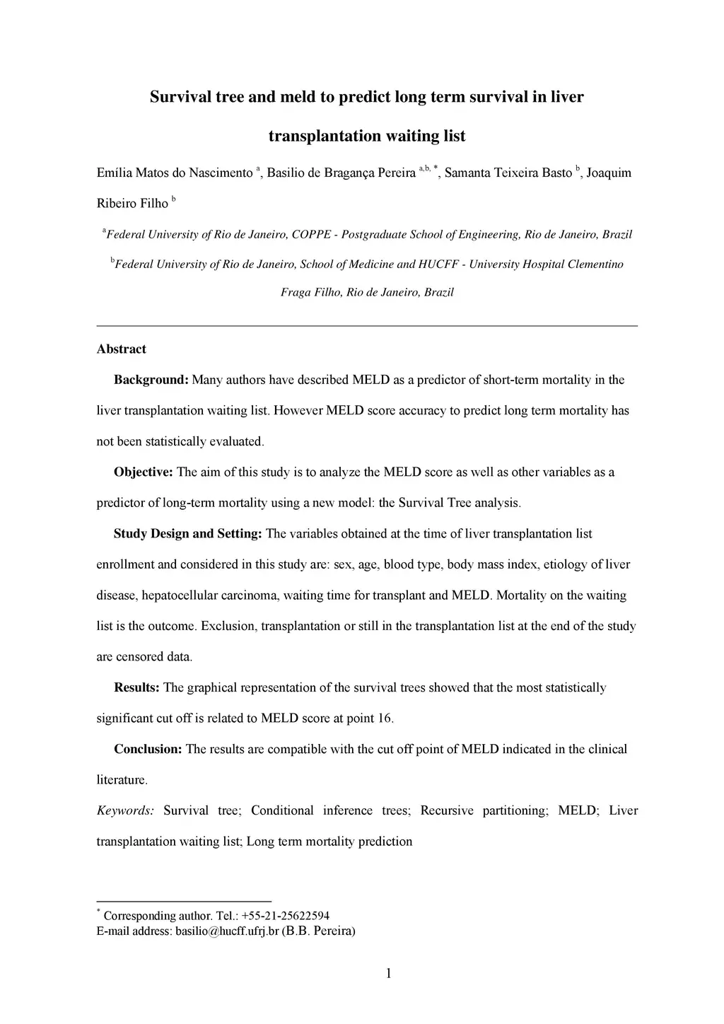 Background: Many authors have described MELD as a predictor of short-term mortality in the liver transplantation waiting list. However MELD score accuracy to predict long term mortality has not been statistically evaluated. Objective: The aim of this study is to analyze the MELD score as well as other variables as a predictor of long-term mortality using a new model: the Survival Tree analysis. Study Design and Setting: The variables obtained at the time of liver transplantation list enrollment and considered in this study are: sex, age, blood type, body mass index, etiology of liver disease, hepatocellular carcinoma, waiting time for transplant and MELD. Mortality on the waiting list is the outcome. Exclusion, transplantation or still in the transplantation list at the end of the study are censored data. Results: The graphical representation of the survival trees showed that the most statistically significant cut off is related to MELD score at point 16. Conclusion: The results are compatible with the cut off point of MELD indicated in the clinical literature.