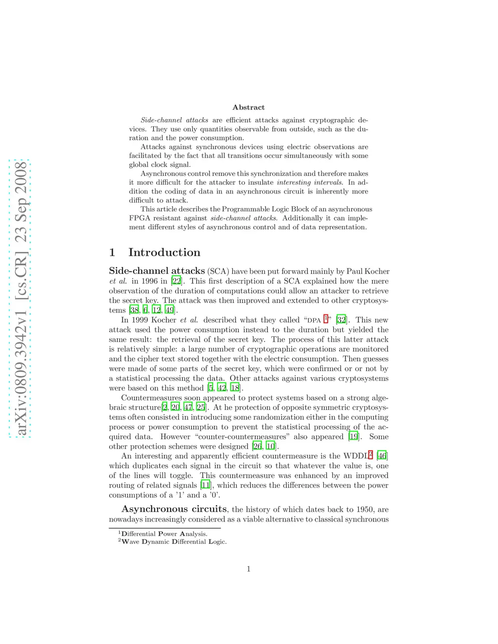 Side-channel attacks are efficient attacks against cryptographic devices. They use only quantities observable from outside, such as the duration and the power consumption. Attacks against synchronous devices using electric observations are facilitated by the fact that all transitions occur simultaneously with some global clock signal. Asynchronous control remove this synchronization and therefore makes it more difficult for the attacker to insulate \emph{interesting intervals}. In addition the coding of data in an asynchronous circuit is inherently more difficult to attack. This article describes the Programmable Logic Block of an asynchronous FPGA resistant against \emph{side-channel attacks}. Additionally it can implement different styles of asynchronous control and of data representation.