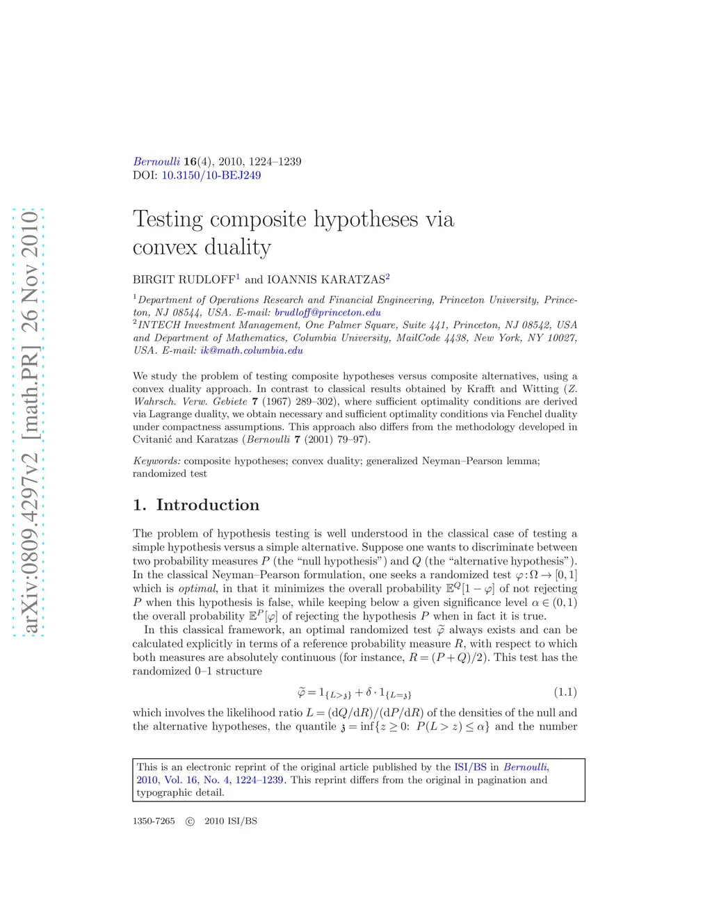 Testing composite hypotheses via convex duality