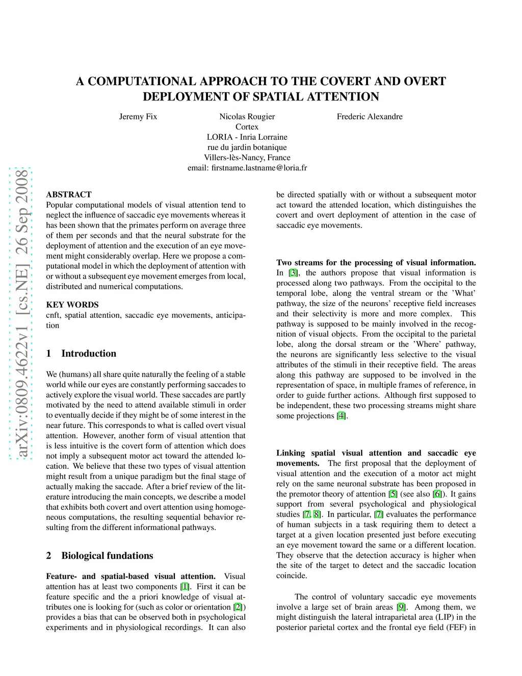 Popular computational models of visual attention tend to neglect the influence of saccadic eye movements whereas it has been shown that the primates perform on average three of them per seconds and that the neural substrate for the deployment of attention and the execution of an eye movement might considerably overlap. Here we propose a computational model in which the deployment of attention with or without a subsequent eye movement emerges from local, distributed and numerical computations.