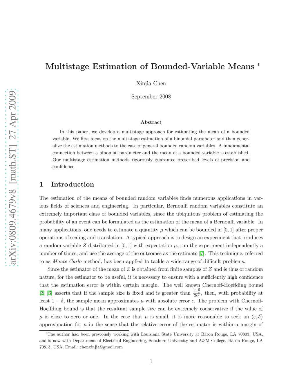 In this paper, we develop a multistage approach for estimating the mean of a bounded variable. We first focus on the multistage estimation of a binomial parameter and then generalize the estimation methods to the case of general bounded random variables. A fundamental connection between a binomial parameter and the mean of a bounded variable is established. Our multistage estimation methods rigorously guarantee prescribed levels of precision and confidence.