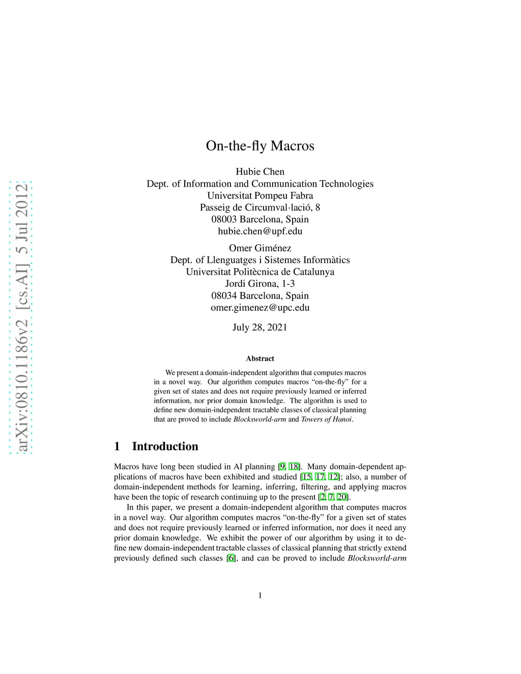 We present a domain-independent algorithm that computes macros in a novel way. Our algorithm computes macros "on-the-fly" for a given set of states and does not require previously learned or inferred information, nor prior domain knowledge. The algorithm is used to define new domain-independent tractable classes of classical planning that are proved to include \emph{Blocksworld-arm} and \emph{Towers of Hanoi}.