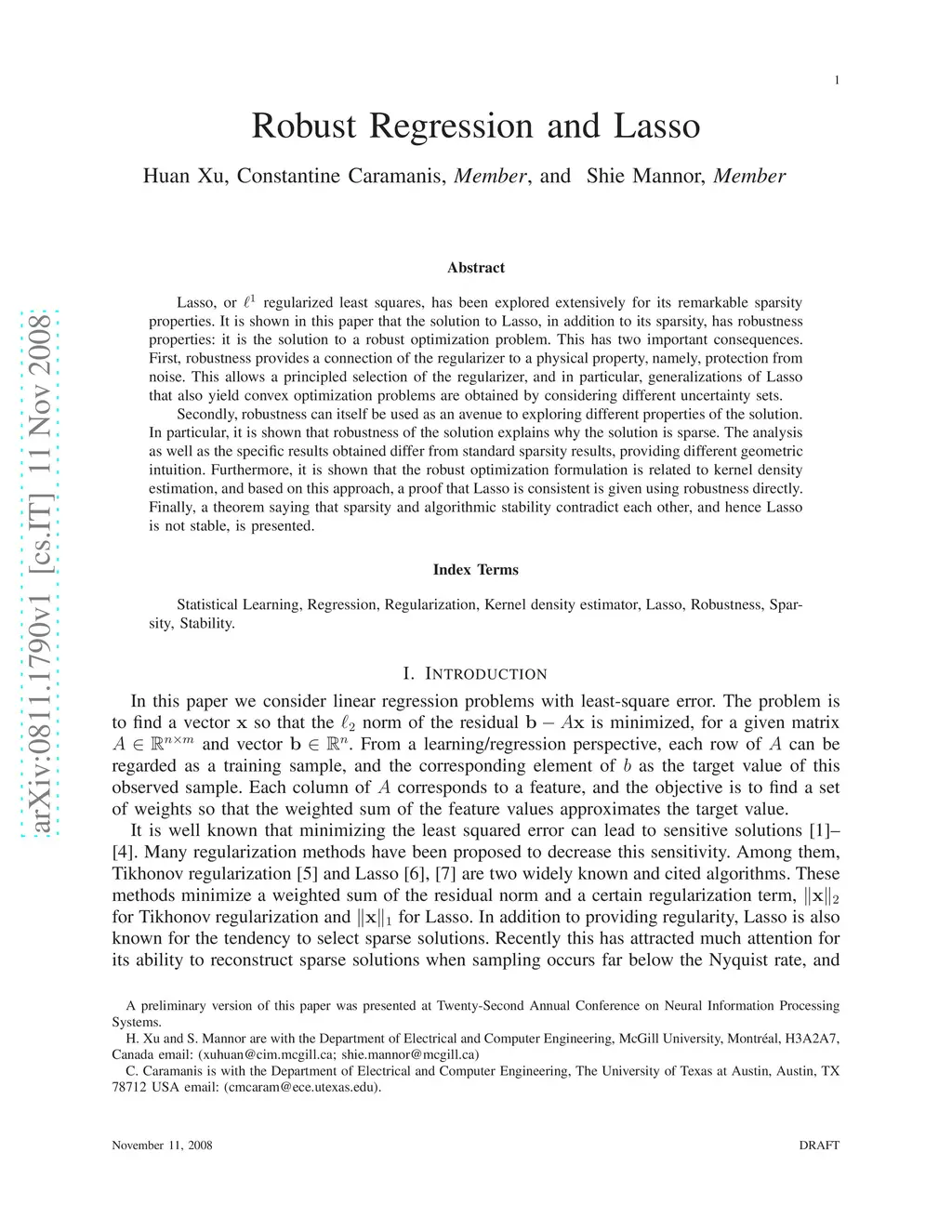 Robust Regression and Lasso
