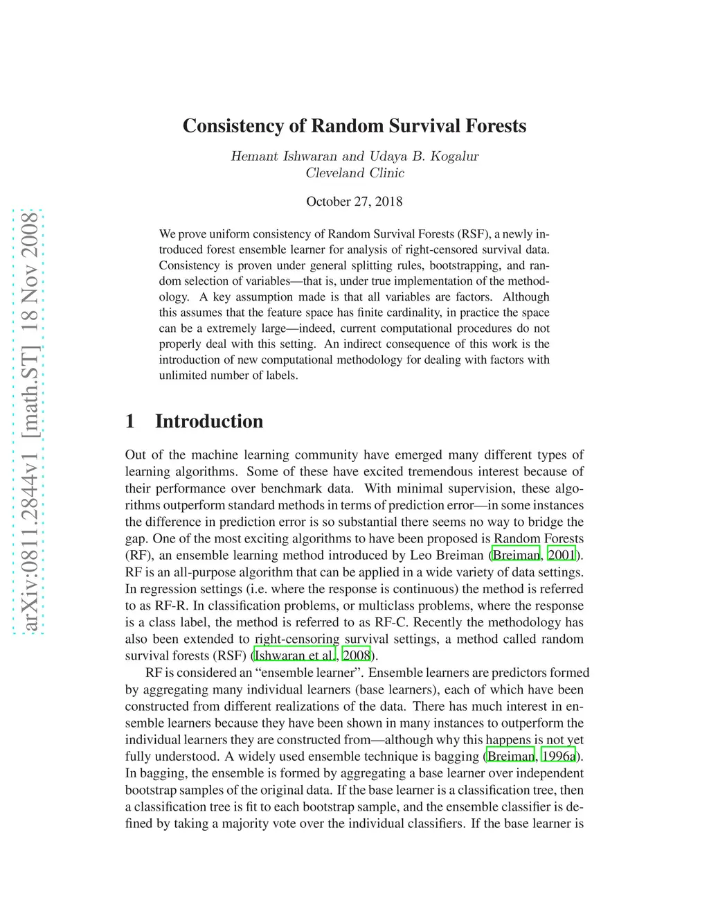 We prove uniform consistency of Random Survival Forests (RSF), a newly introduced forest ensemble learner for analysis of right-censored survival data. Consistency is proven under general splitting rules, bootstrapping, and random selection of variables--that is, under true implementation of the methodology. A key assumption made is that all variables are factors. Although this assumes that the feature space has finite cardinality, in practice the space can be a extremely large--indeed, current computational procedures do not properly deal with this setting. An indirect consequence of this work is the introduction of new computational methodology for dealing with factors with unlimited number of labels.
