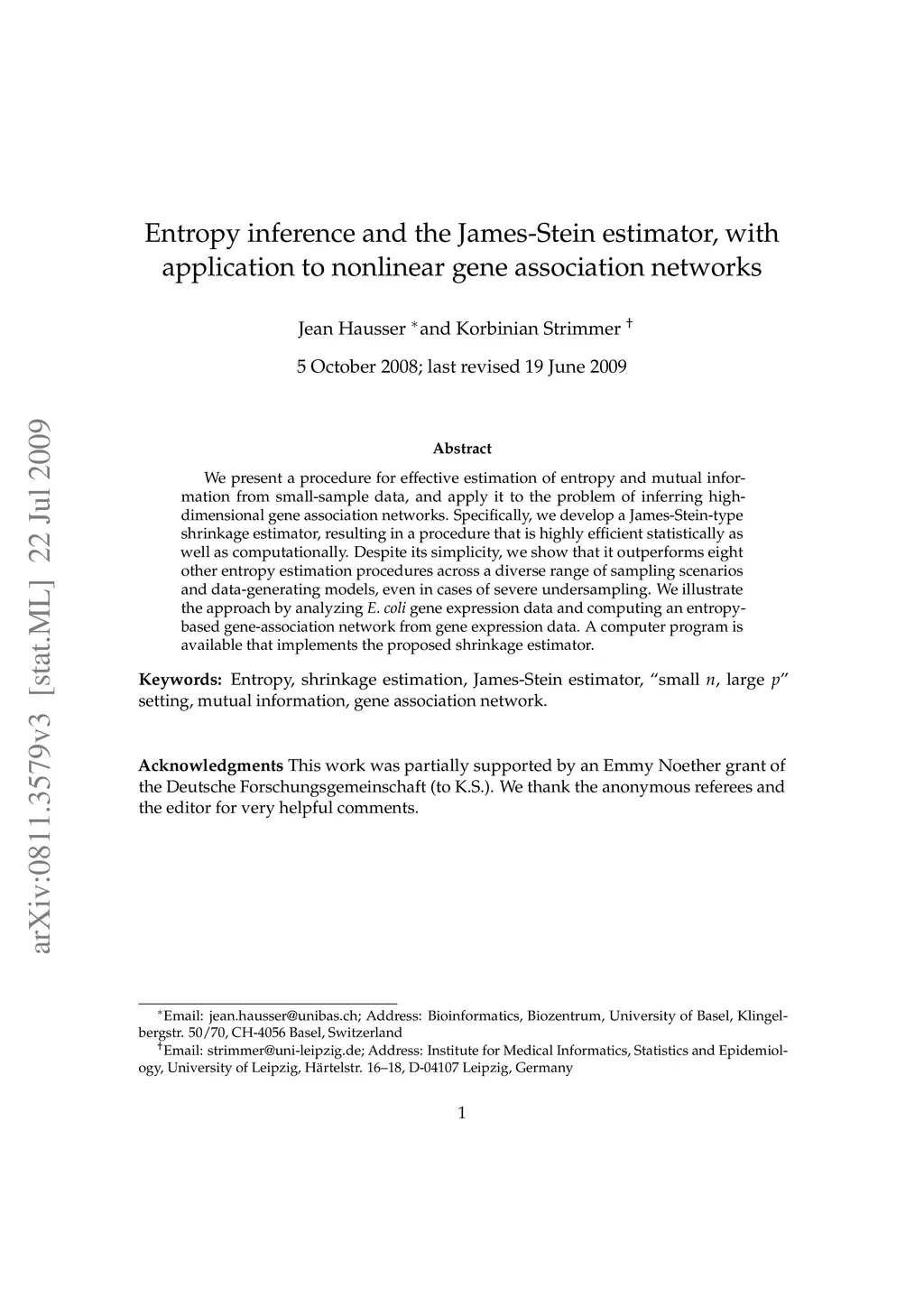 We present a procedure for effective estimation of entropy and mutual information from small-sample data, and apply it to the problem of inferring high-dimensional gene association networks. Specifically, we develop a James-Stein-type shrinkage estimator, resulting in a procedure that is highly efficient statistically as well as computationally. Despite its simplicity, we show that it outperforms eight other entropy estimation procedures across a diverse range of sampling scenarios and data-generating models, even in cases of severe undersampling. We illustrate the approach by analyzing E. coli gene expression data and computing an entropy-based gene-association network from gene expression data. A computer program is available that implements the proposed shrinkage estimator.