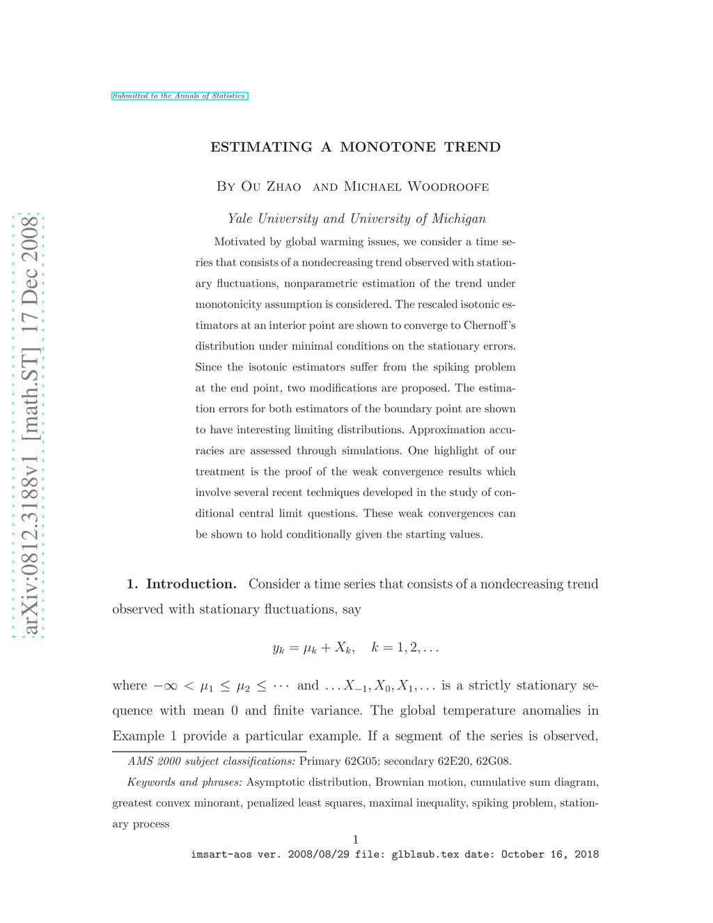 Motivated by global warming issues, we consider a time se- ries that consists of a nondecreasing trend observed with station- ary fluctuations, nonparametric estimation of the trend under monotonicity assumption is considered. The rescaled isotonic es- timators at an interior point are shown to converge to Chernoff's distribution under minimal conditions on the stationary errors. Since the isotonic estimators suffer from the spiking problem at the end point, two modifications are proposed. The estima- tion errors for both estimators of the boundary point are shown to have interesting limiting distributions. Approximation accu- racies are assessed through simulations. One highlight of our treatment is the proof of the weak convergence results which involve several recent techniques developed in the study of con- ditional central limit questions. These weak convergences can be shown to hold conditionally given the starting values.