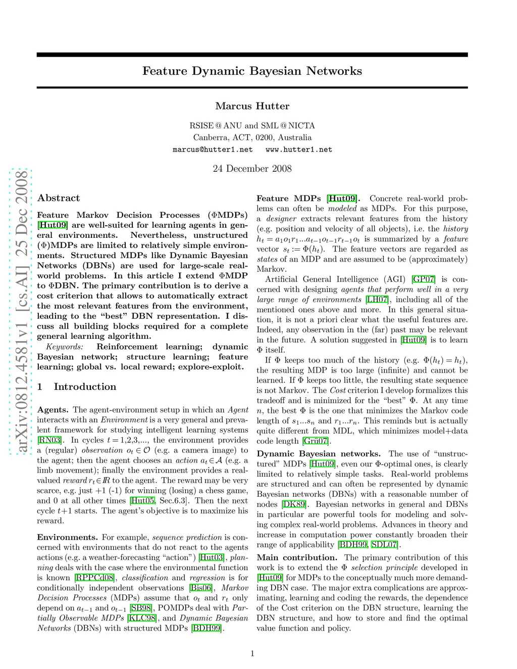 Feature Markov Decision Processes (PhiMDPs) are well-suited for learning agents in general environments. Nevertheless, unstructured (Phi)MDPs are limited to relatively simple environments. Structured MDPs like Dynamic Bayesian Networks (DBNs) are used for large-scale real-world problems. In this article I extend PhiMDP to PhiDBN. The primary contribution is to derive a cost criterion that allows to automatically extract the most relevant features from the environment, leading to the "best" DBN representation. I discuss all building blocks required for a complete general learning algorithm.