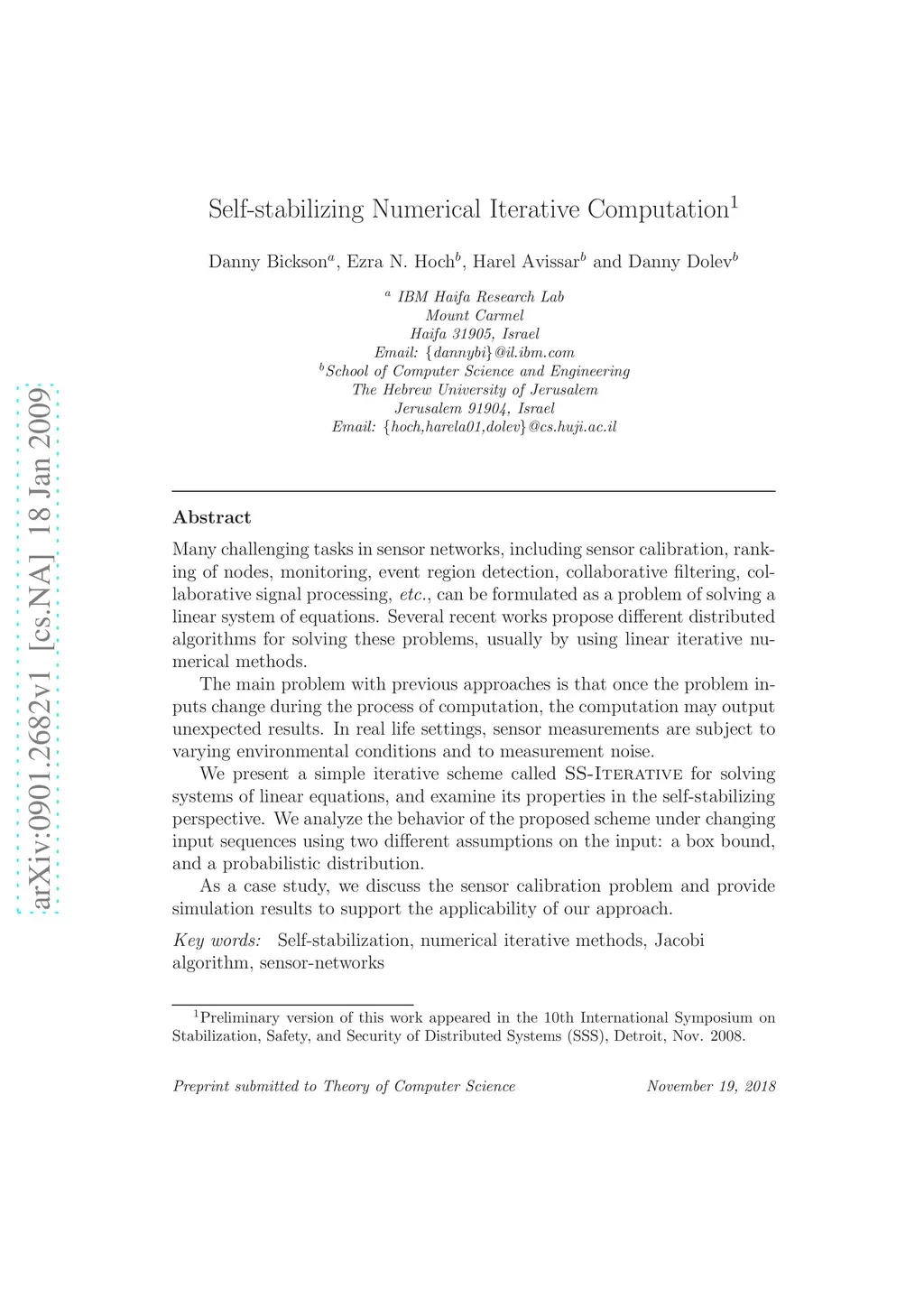 Many challenging tasks in sensor networks, including sensor calibration, ranking of nodes, monitoring, event region detection, collaborative filtering, collaborative signal processing, {\em etc.}, can be formulated as a problem of solving a linear system of equations. Several recent works propose different distributed algorithms for solving these problems, usually by using linear iterative numerical methods. The main problem with previous approaches is that once the problem inputs change during the process of computation, the computation may output unexpected results. In real life settings, sensor measurements are subject to varying environmental conditions and to measurement noise. We present a simple iterative scheme called SS-Iterative for solving systems of linear equations, and examine its properties in the self-stabilizing perspective. We analyze the behavior of the proposed scheme under changing input sequences using two different assumptions on the input: a box bound, and a probabilistic distribution. As a case study, we discuss the sensor calibration problem and provide simulation results to support the applicability of our approach.