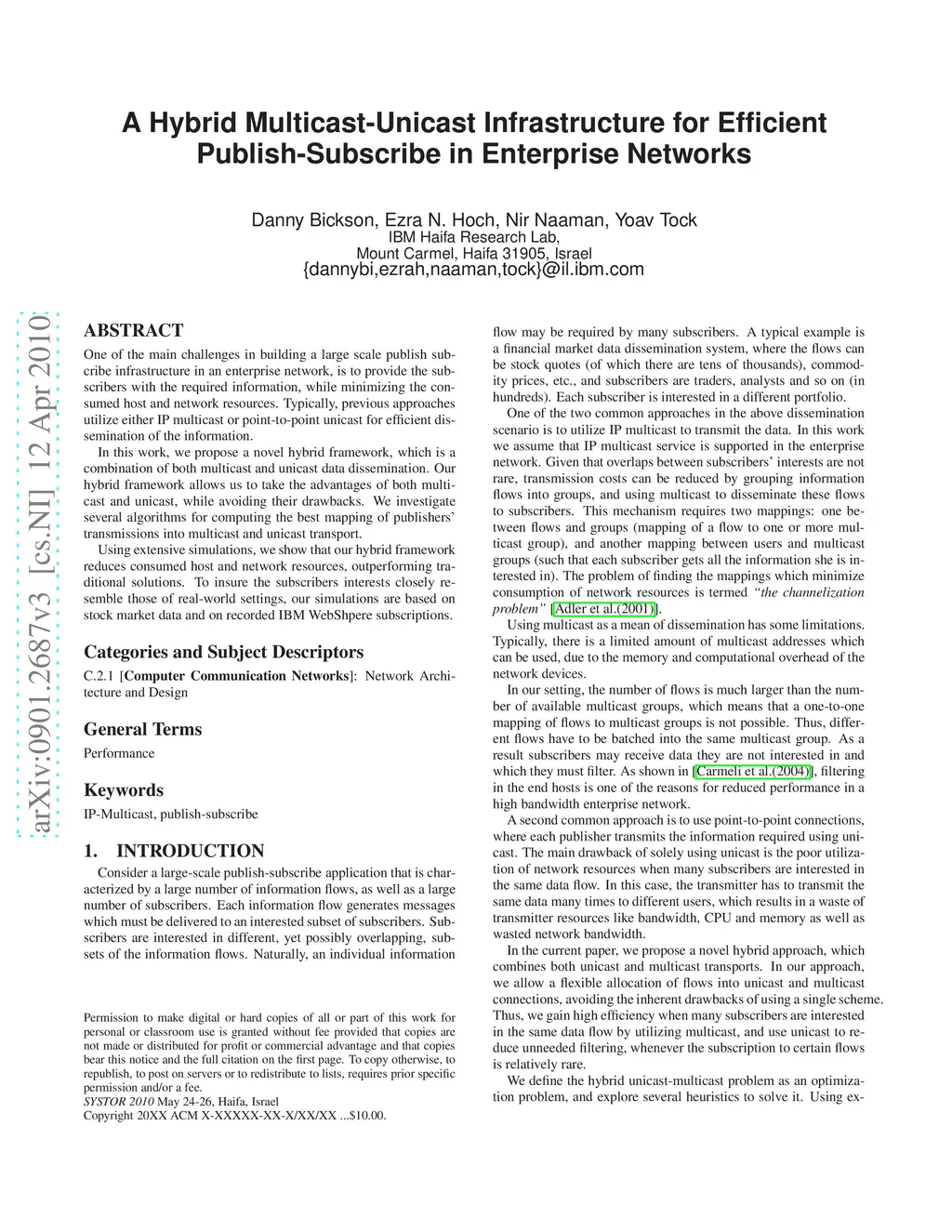 One of the main challenges in building a large scale publish-subscribe infrastructure in an enterprise network, is to provide the subscribers with the required information, while minimizing the consumed host and network resources. Typically, previous approaches utilize either IP multicast or point-to-point unicast for efficient dissemination of the information. In this work, we propose a novel hybrid framework, which is a combination of both multicast and unicast data dissemination. Our hybrid framework allows us to take the advantages of both multicast and unicast, while avoiding their drawbacks. We investigate several algorithms for computing the best mapping of publishers' transmissions into multicast and unicast transport. Using extensive simulations, we show that our hybrid framework reduces consumed host and network resources, outperforming traditional solutions. To insure the subscribers interests closely resemble those of real-world settings, our simulations are based on stock market data and on recorded IBM WebShpere subscriptions.