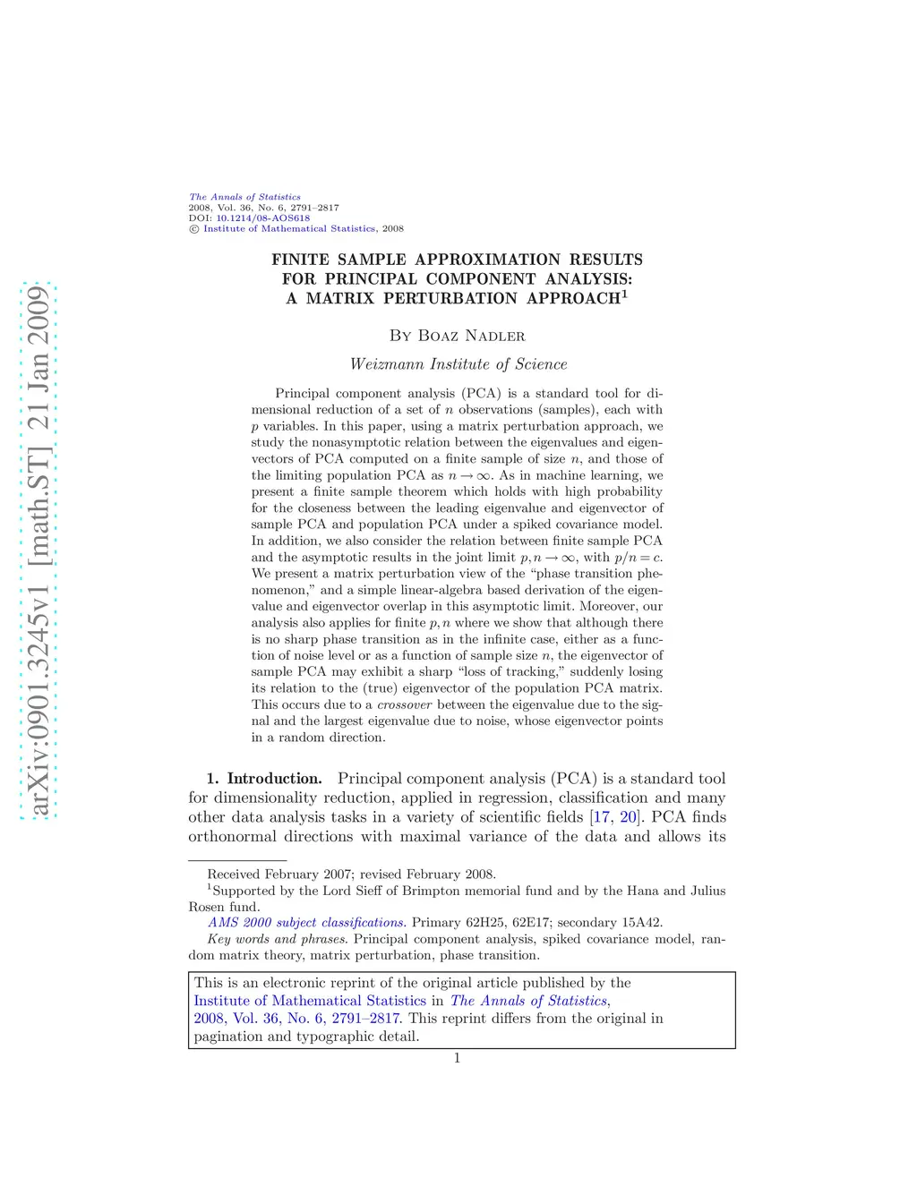 Principal component analysis (PCA) is a standard tool for dimensional reduction of a set of observations (samples), each with variables. In this paper, using a matrix perturbation approach, we study the nonasymptotic relation between the eigenvalues and eigenvectors of PCA computed on a finite sample of size , and those of the limiting population PCA as . As in machine learning, we present a finite sample theorem which holds with high probability for the closeness between the leading eigenvalue and eigenvector of sample PCA and population PCA under a spiked covariance model. In addition, we also consider the relation between finite sample PCA and the asymptotic results in the joint limit , with . We present a matrix perturbation view of the "phase transition phenomenon," and a simple linear-algebra based derivation of the eigenvalue and eigenvector overlap in this asymptotic limit. Moreover, our analysis also applies for finite where we show that although there is no sharp phase transition as in the infinite case, either as a function of noise level or as a function of sample size , the eigenvector of sample PCA may exhibit a sharp "loss of tracking," suddenly losing its relation to the (true) eigenvector of the population PCA matrix. This occurs due to a crossover between the eigenvalue due to the signal and the largest eigenvalue due to noise, whose eigenvector points in a random direction.