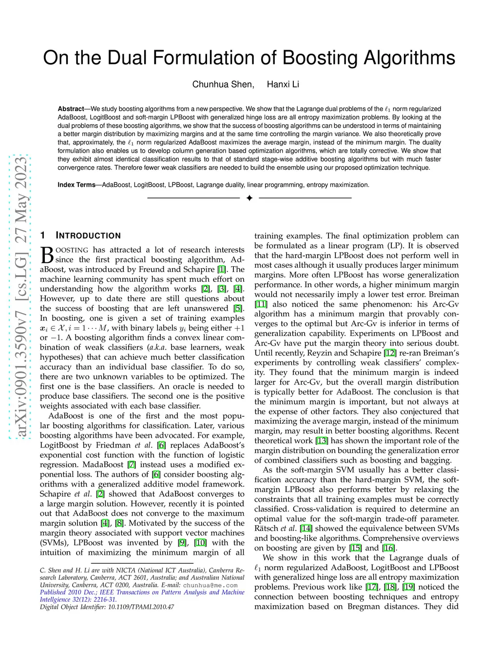 We study boosting algorithms from a new perspective. We show that the Lagrange dual problems of AdaBoost, LogitBoost and soft-margin LPBoost with generalized hinge loss are all entropy maximization problems. By looking at the dual problems of these boosting algorithms, we show that the success of boosting algorithms can be understood in terms of maintaining a better margin distribution by maximizing margins and at the same time controlling the margin variance.We also theoretically prove that, approximately, AdaBoost maximizes the average margin, instead of the minimum margin. The duality formulation also enables us to develop column generation based optimization algorithms, which are totally corrective. We show that they exhibit almost identical classification results to that of standard stage-wise additive boosting algorithms but with much faster convergence rates. Therefore fewer weak classifiers are needed to build the ensemble using our proposed optimization technique.