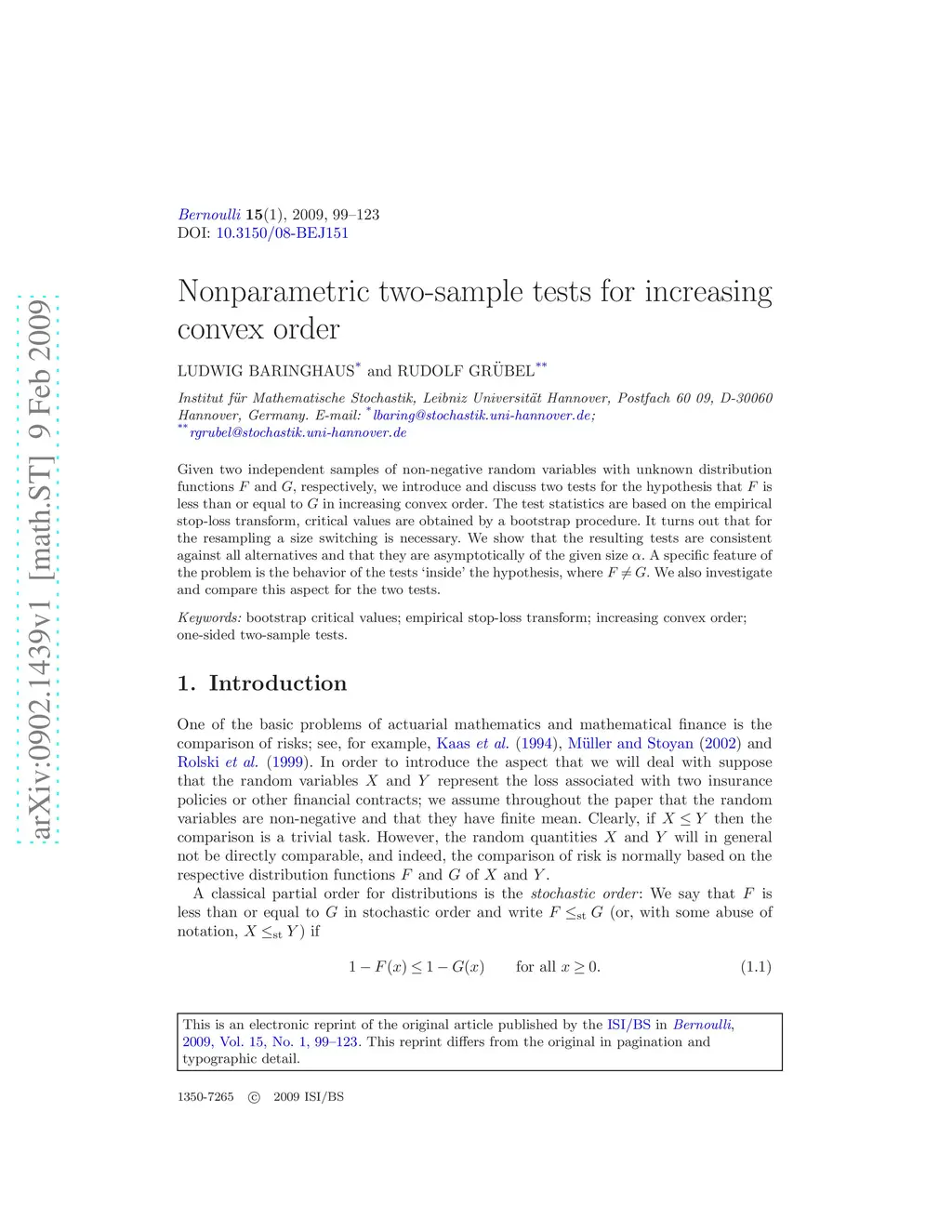 Given two independent samples of non-negative random variables with unknown distribution functions and , respectively, we introduce and discuss two tests for the hypothesis that is less than or equal to in increasing convex order. The test statistics are based on the empirical stop-loss transform, critical values are obtained by a bootstrap procedure. It turns out that for the resampling a size switching is necessary. We show that the resulting tests are consistent against all alternatives and that they are asymptotically of the given size . A specific feature of the problem is the behavior of the tests `inside' the hypothesis, where . We also investigate and compare this aspect for the two tests.
