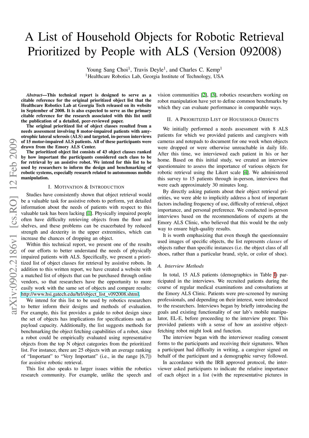 This technical report is designed to serve as a citable reference for the original prioritized object list that the Healthcare Robotics Lab at Georgia Tech released on its website in September of 2008. It is also expected to serve as the primary citable reference for the research associated with this list until the publication of a detailed, peer-reviewed paper. The original prioritized list of object classes resulted from a needs assessment involving 8 motor-impaired patients with amyotrophic lateral sclerosis (ALS) and targeted, in-person interviews of 15 motor-impaired ALS patients. All of these participants were drawn from the Emory ALS Center. The prioritized object list consists of 43 object classes ranked by how important the participants considered each class to be for retrieval by an assistive robot. We intend for this list to be used by researchers to inform the design and benchmarking of robotic systems, especially research related to autonomous mobile manipulation.
