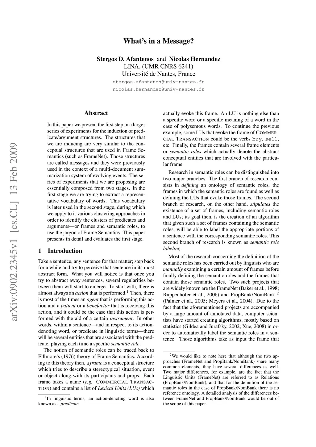 In this paper we present the first step in a larger series of experiments for the induction of predicate/argument structures. The structures that we are inducing are very similar to the conceptual structures that are used in Frame Semantics (such as FrameNet). Those structures are called messages and they were previously used in the context of a multi-document summarization system of evolving events. The series of experiments that we are proposing are essentially composed from two stages. In the first stage we are trying to extract a representative vocabulary of words. This vocabulary is later used in the second stage, during which we apply to it various clustering approaches in order to identify the clusters of predicates and arguments--or frames and semantic roles, to use the jargon of Frame Semantics. This paper presents in detail and evaluates the first stage.