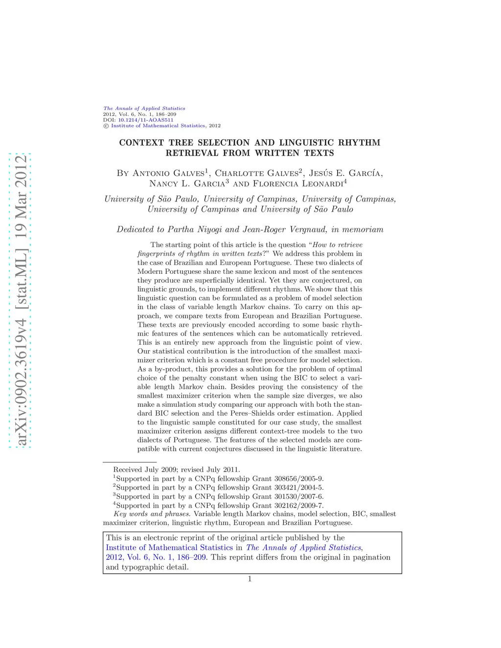 The starting point of this article is the question "How to retrieve fingerprints of rhythm in written texts?" We address this problem in the case of Brazilian and European Portuguese. These two dialects of Modern Portuguese share the same lexicon and most of the sentences they produce are superficially identical. Yet they are conjectured, on linguistic grounds, to implement different rhythms. We show that this linguistic question can be formulated as a problem of model selection in the class of variable length Markov chains. To carry on this approach, we compare texts from European and Brazilian Portuguese. These texts are previously encoded according to some basic rhythmic features of the sentences which can be automatically retrieved. This is an entirely new approach from the linguistic point of view. Our statistical contribution is the introduction of the smallest maximizer criterion which is a constant free procedure for model selection. As a by-product, this provides a solution for the problem of optimal choice of the penalty constant when using the BIC to select a variable length Markov chain. Besides proving the consistency of the smallest maximizer criterion when the sample size diverges, we also make a simulation study comparing our approach with both the standard BIC selection and the Peres-Shields order estimation. Applied to the linguistic sample constituted for our case study, the smallest maximizer criterion assigns different context-tree models to the two dialects of Portuguese. The features of the selected models are compatible with current conjectures discussed in the linguistic literature.