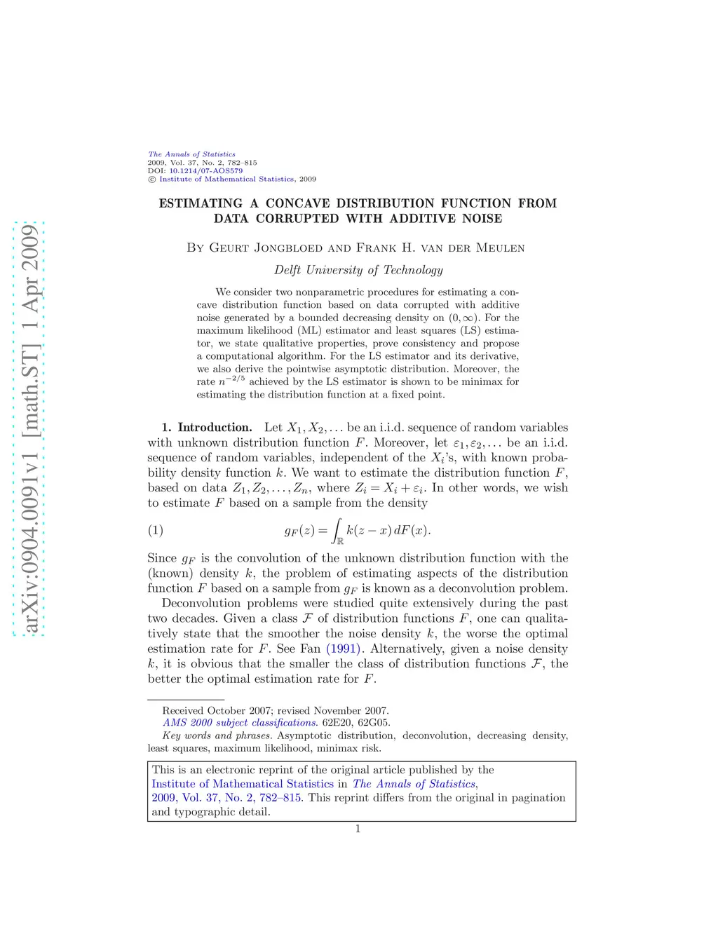 We consider two nonparametric procedures for estimating a concave distribution function based on data corrupted with additive noise generated by a bounded decreasing density on . For the maximum likelihood (ML) estimator and least squares (LS) estimator, we state qualitative properties, prove consistency and propose a computational algorithm. For the LS estimator and its derivative, we also derive the pointwise asymptotic distribution. Moreover, the rate achieved by the LS estimator is shown to be minimax for estimating the distribution function at a fixed point.