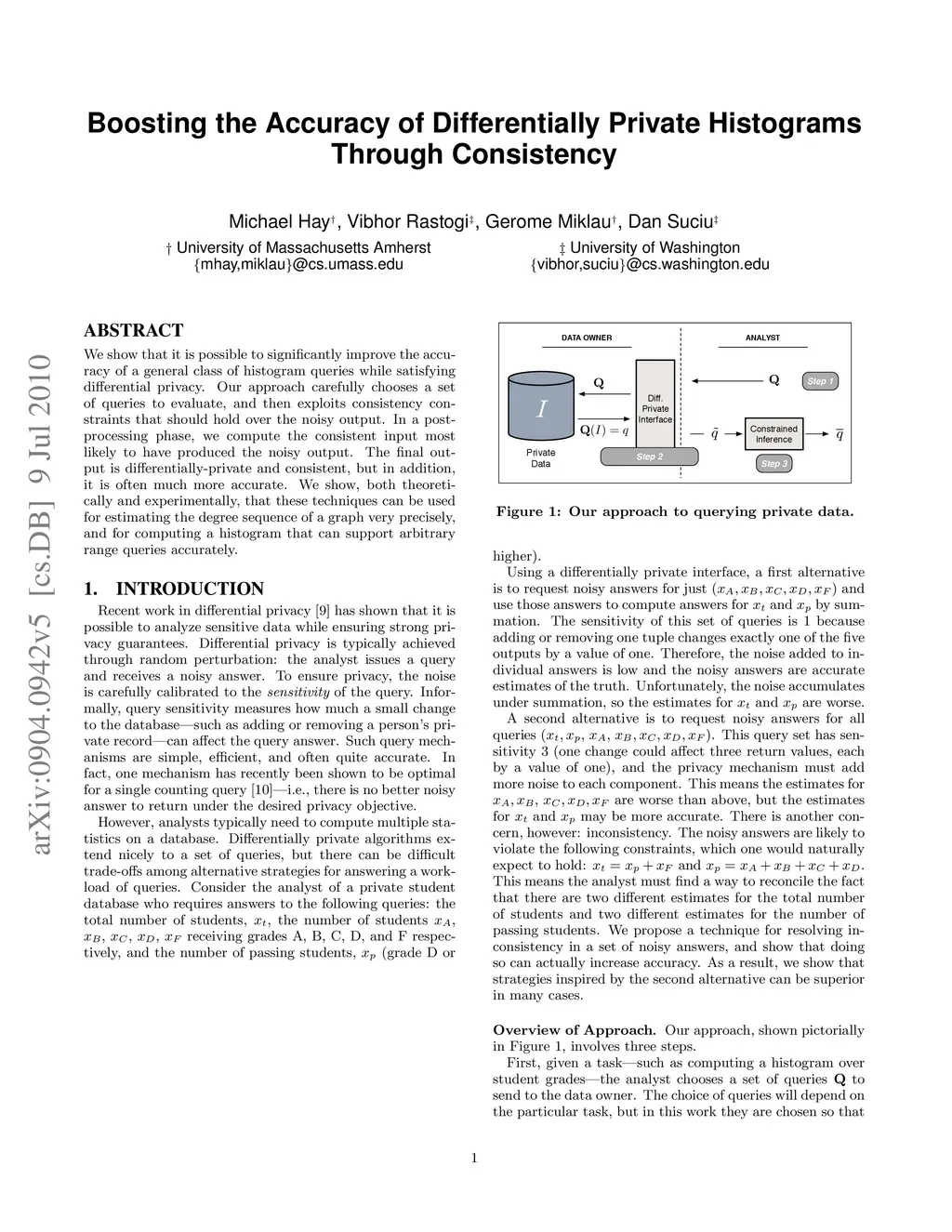 We show that it is possible to significantly improve the accuracy of a general class of histogram queries while satisfying differential privacy. Our approach carefully chooses a set of queries to evaluate, and then exploits consistency constraints that should hold over the noisy output. In a post-processing phase, we compute the consistent input most likely to have produced the noisy output. The final output is differentially-private and consistent, but in addition, it is often much more accurate. We show, both theoretically and experimentally, that these techniques can be used for estimating the degree sequence of a graph very precisely, and for computing a histogram that can support arbitrary range queries accurately.