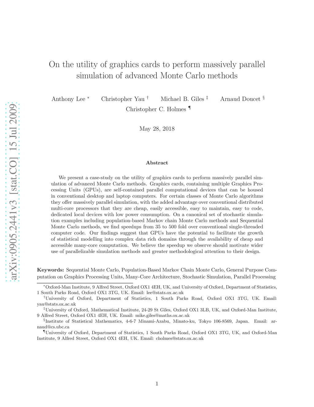 We present a case-study on the utility of graphics cards to perform massively parallel simulation of advanced Monte Carlo methods. Graphics cards, containing multiple Graphics Processing Units (GPUs), are self-contained parallel computational devices that can be housed in conventional desktop and laptop computers. For certain classes of Monte Carlo algorithms they offer massively parallel simulation, with the added advantage over conventional distributed multi-core processors that they are cheap, easily accessible, easy to maintain, easy to code, dedicated local devices with low power consumption. On a canonical set of stochastic simulation examples including population-based Markov chain Monte Carlo methods and Sequential Monte Carlo methods, we find speedups from 35 to 500 fold over conventional single-threaded computer code. Our findings suggest that GPUs have the potential to facilitate the growth of statistical modelling into complex data rich domains through the availability of cheap and accessible many-core computation. We believe the speedup we observe should motivate wider use of parallelizable simulation methods and greater methodological attention to their design.