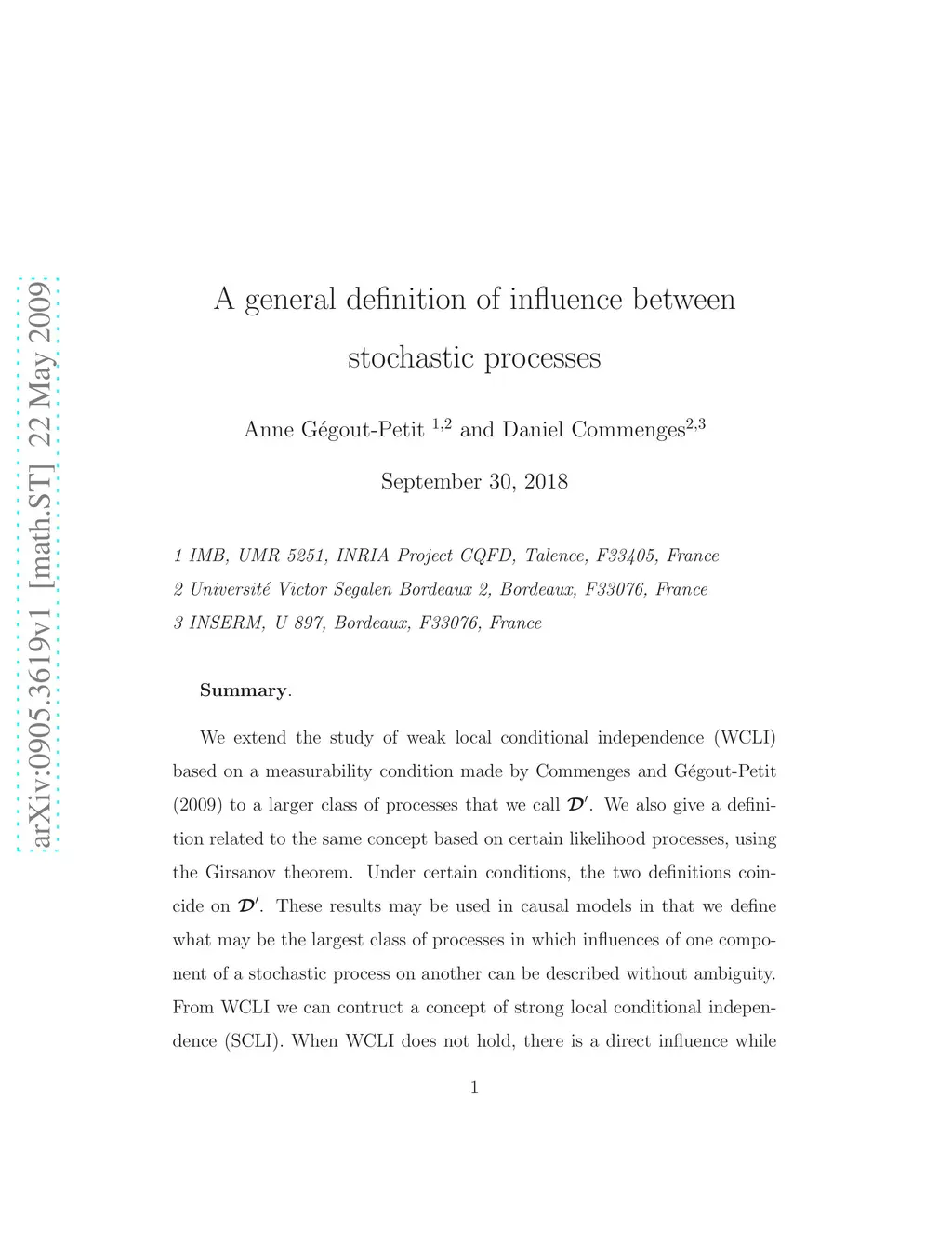 We extend the study of weak local conditional independence (WCLI) based on a measurability condition made by Commenges and G\égout-Petit (2009) to a larger class of processes that we call D'. We also give a definition related to the same concept based on certain likelihood processes, using the Girsanov theorem. Under certain conditions, the two definitions coincide on D'. These results may be used in causal models in that we define what may be the largest class of processes in which influences of one component of a stochastic process on another can be described without ambiguity. From WCLI we can contruct a concept of strong local conditional independence (SCLI). When WCLI does not hold, there is a direct influence while when SCLI does not hold there is direct or indirect influence. We investigate whether WCLI and SCLI can be defined via conventional independence conditions and find that this is the case for the latter but not for the former. Finally we recall that causal interpretation does not follow from mere mathematical definitions, but requires working with a good system and with the true probability.