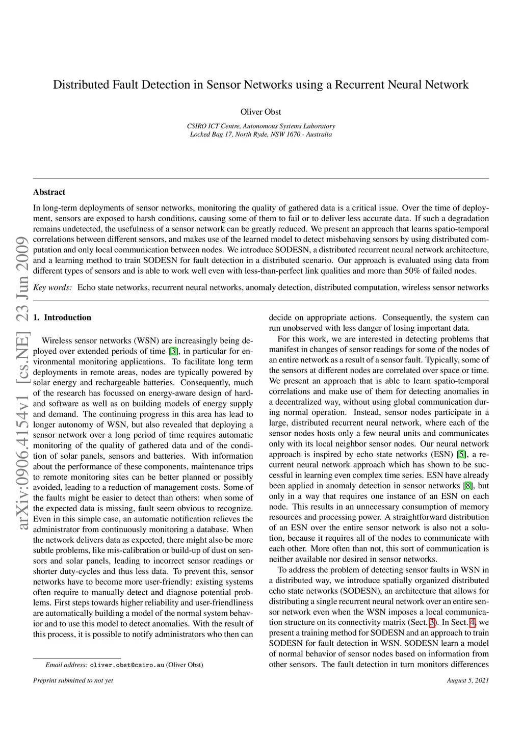 In long-term deployments of sensor networks, monitoring the quality of gathered data is a critical issue. Over the time of deployment, sensors are exposed to harsh conditions, causing some of them to fail or to deliver less accurate data. If such a degradation remains undetected, the usefulness of a sensor network can be greatly reduced. We present an approach that learns spatio-temporal correlations between different sensors, and makes use of the learned model to detect misbehaving sensors by using distributed computation and only local communication between nodes. We introduce SODESN, a distributed recurrent neural network architecture, and a learning method to train SODESN for fault detection in a distributed scenario. Our approach is evaluated using data from different types of sensors and is able to work well even with less-than-perfect link qualities and more than 50% of failed nodes.