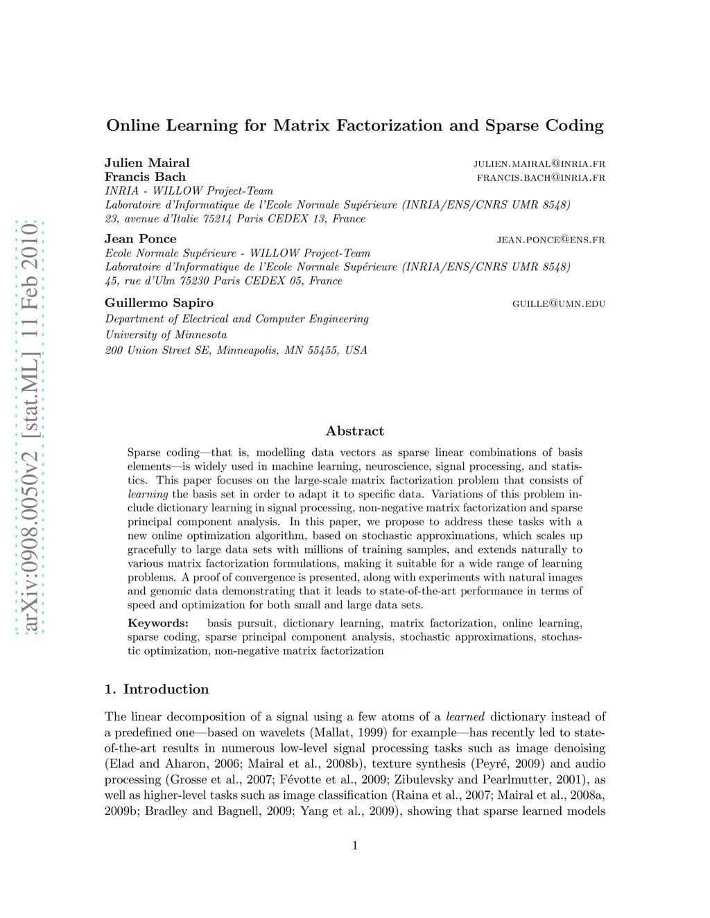 Sparse coding--that is, modelling data vectors as sparse linear combinations of basis elements--is widely used in machine learning, neuroscience, signal processing, and statistics. This paper focuses on the large-scale matrix factorization problem that consists of learning the basis set, adapting it to specific data. Variations of this problem include dictionary learning in signal processing, non-negative matrix factorization and sparse principal component analysis. In this paper, we propose to address these tasks with a new online optimization algorithm, based on stochastic approximations, which scales up gracefully to large datasets with millions of training samples, and extends naturally to various matrix factorization formulations, making it suitable for a wide range of learning problems. A proof of convergence is presented, along with experiments with natural images and genomic data demonstrating that it leads to state-of-the-art performance in terms of speed and optimization for both small and large datasets.