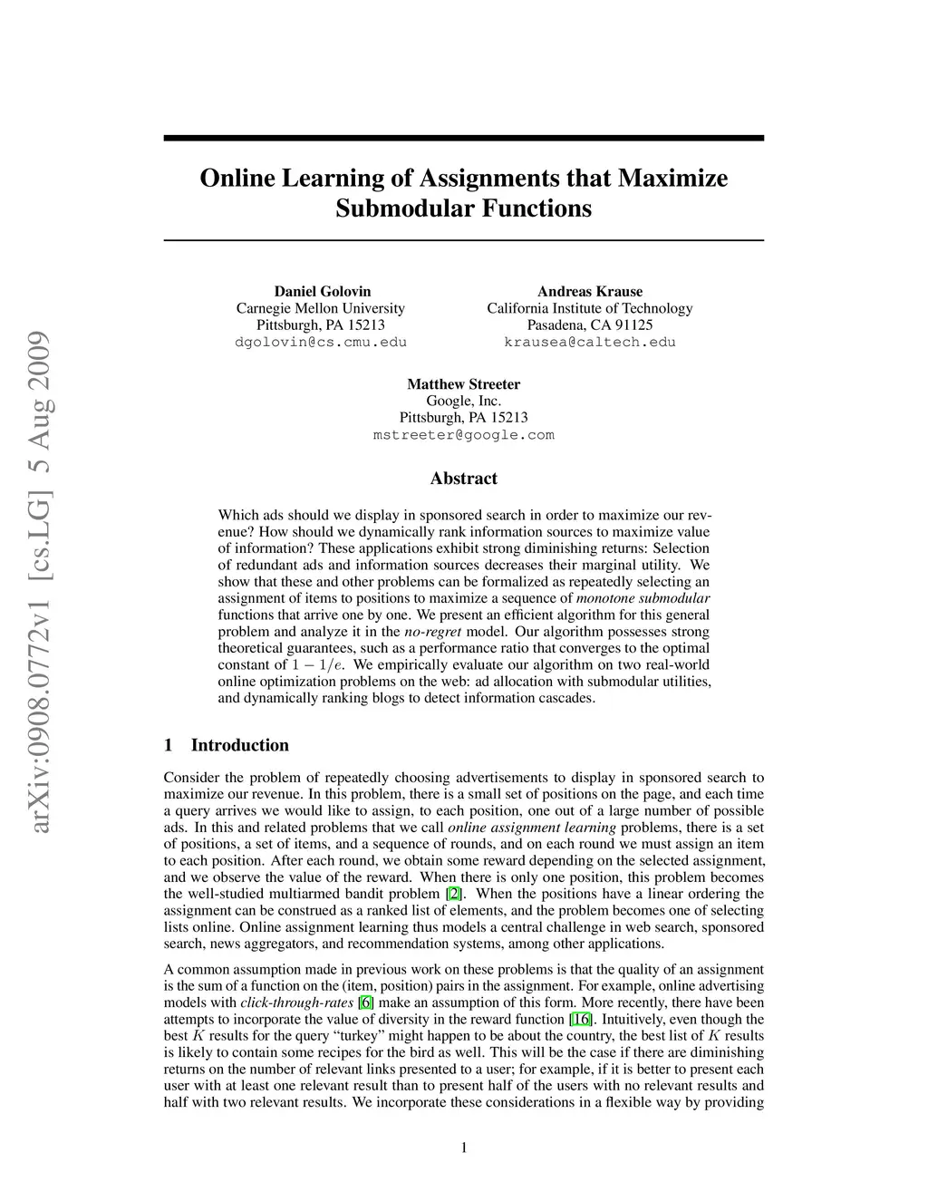 Which ads should we display in sponsored search in order to maximize our revenue? How should we dynamically rank information sources to maximize value of information? These applications exhibit strong diminishing returns: Selection of redundant ads and information sources decreases their marginal utility. We show that these and other problems can be formalized as repeatedly selecting an assignment of items to positions to maximize a sequence of monotone submodular functions that arrive one by one. We present an efficient algorithm for this general problem and analyze it in the no-regret model. Our algorithm possesses strong theoretical guarantees, such as a performance ratio that converges to the optimal constant of 1-1/e. We empirically evaluate our algorithm on two real-world online optimization problems on the web: ad allocation with submodular utilities, and dynamically ranking blogs to detect information cascades.