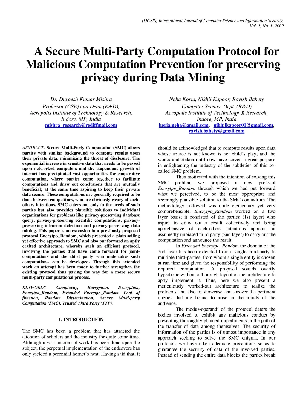 Secure Multi-Party Computation (SMC) allows parties with similar background to compute results upon their private data, minimizing the threat of disclosure. The exponential increase in sensitive data that needs to be passed upon networked computers and the stupendous growth of internet has precipitated vast opportunities for cooperative computation, where parties come together to facilitate computations and draw out conclusions that are mutually beneficial; at the same time aspiring to keep their private data secure. These computations are generally required to be done between competitors, who are obviously weary of each-others intentions. SMC caters not only to the needs of such parties but also provides plausible solutions to individual organizations for problems like privacy-preserving database query, privacy-preserving scientific computations, privacy-preserving intrusion detection and privacy-preserving data mining. This paper is an extension to a previously proposed protocol Encrytpo_Random, which presented a plain sailing yet effective approach to SMC and also put forward an aptly crafted architecture, whereby such an efficient protocol, involving the parties that have come forward for joint-computations and the third party who undertakes such computations, can be developed. Through this extended work an attempt has been made to further strengthen the existing protocol thus paving the way for a more secure multi-party computational process.