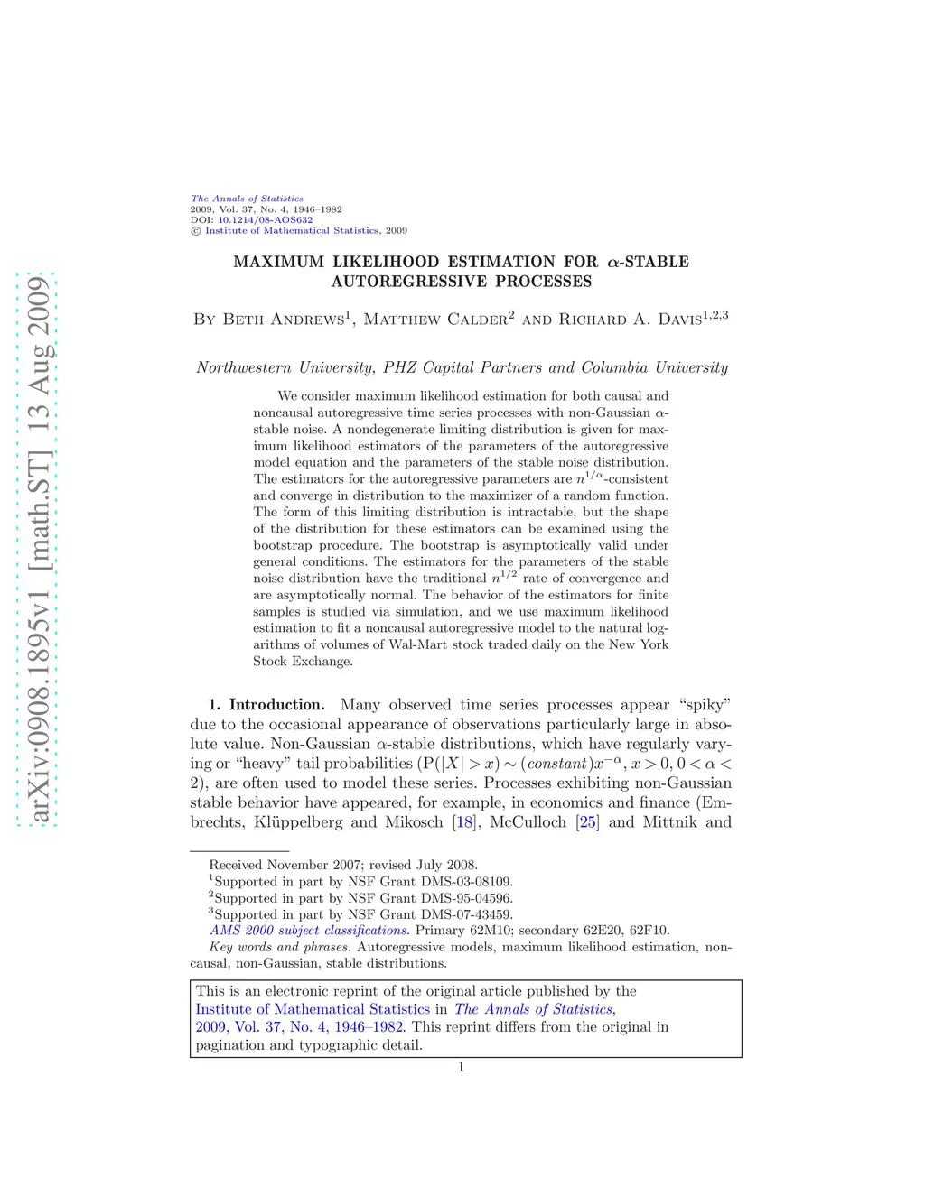 We consider maximum likelihood estimation for both causal and noncausal autoregressive time series processes with non-Gaussian -stable noise. A nondegenerate limiting distribution is given for maximum likelihood estimators of the parameters of the autoregressive model equation and the parameters of the stable noise distribution. The estimators for the autoregressive parameters are -consistent and converge in distribution to the maximizer of a random function. The form of this limiting distribution is intractable, but the shape of the distribution for these estimators can be examined using the bootstrap procedure. The bootstrap is asymptotically valid under general conditions. The estimators for the parameters of the stable noise distribution have the traditional rate of convergence and are asymptotically normal. The behavior of the estimators for finite samples is studied via simulation, and we use maximum likelihood estimation to fit a noncausal autoregressive model to the natural logarithms of volumes of Wal-Mart stock traded daily on the New York Stock Exchange.