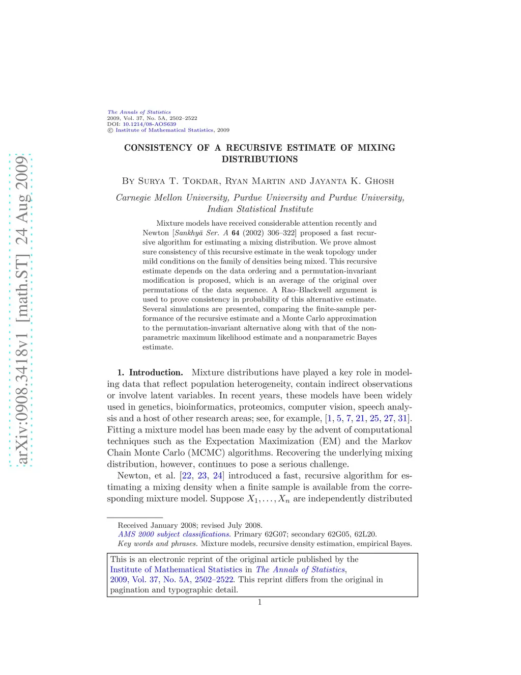 Mixture models have received considerable attention recently and Newton [Sankhy\={a} Ser. A 64 (2002) 306--322] proposed a fast recursive algorithm for estimating a mixing distribution. We prove almost sure consistency of this recursive estimate in the weak topology under mild conditions on the family of densities being mixed. This recursive estimate depends on the data ordering and a permutation-invariant modification is proposed, which is an average of the original over permutations of the data sequence. A Rao--Blackwell argument is used to prove consistency in probability of this alternative estimate. Several simulations are presented, comparing the finite-sample performance of the recursive estimate and a Monte Carlo approximation to the permutation-invariant alternative along with that of the nonparametric maximum likelihood estimate and a nonparametric Bayes estimate.