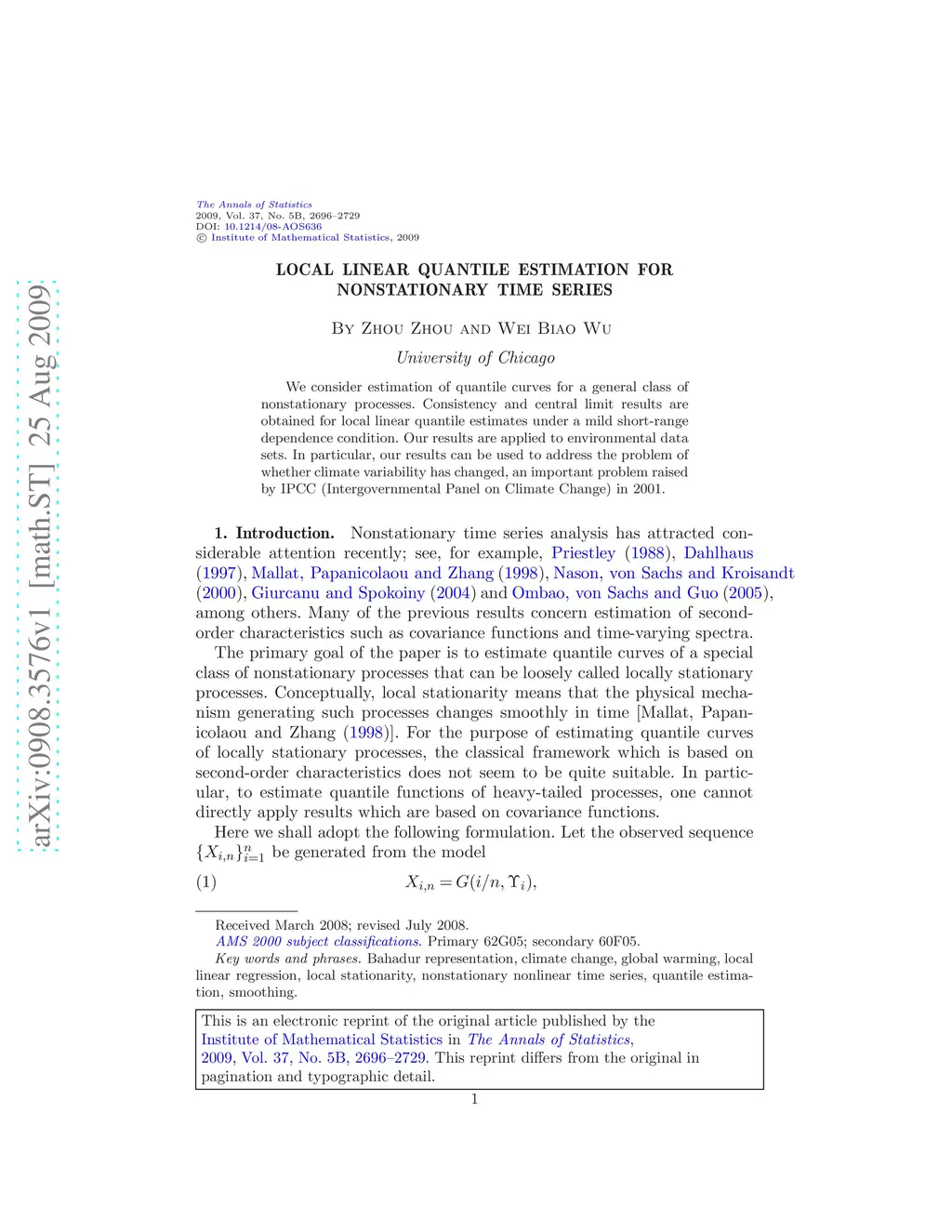We consider estimation of quantile curves for a general class of nonstationary processes. Consistency and central limit results are obtained for local linear quantile estimates under a mild short-range dependence condition. Our results are applied to environmental data sets. In particular, our results can be used to address the problem of whether climate variability has changed, an important problem raised by IPCC (Intergovernmental Panel on Climate Change) in 2001.