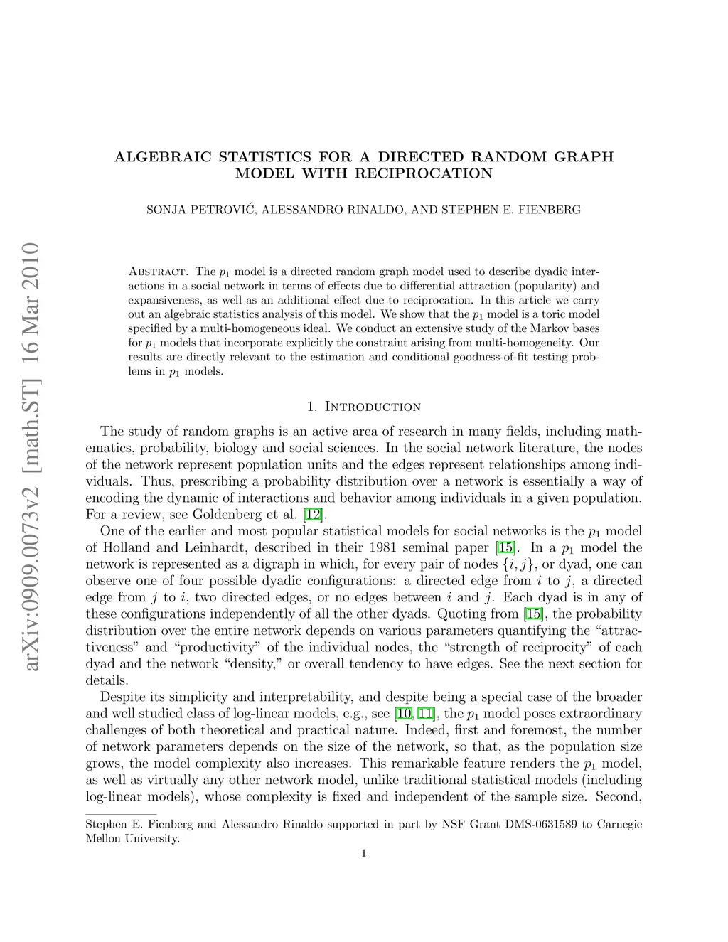 The p_1 model is a directed random graph model used to describe dyadic interactions in a social network in terms of effects due to differential attraction (popularity) and expansiveness, as well as an additional effect due to reciprocation. In this article we carry out an algebraic statistics analysis of this model. We show that the p_1 model is a toric model specified by a multi-homogeneous ideal. We conduct an extensive study of the Markov bases for p_1 models that incorporate explicitly the constraint arising from multi-homogeneity. Our results are directly relevant to the estimation and conditional goodness-of-fit testing problems in p_1 models.