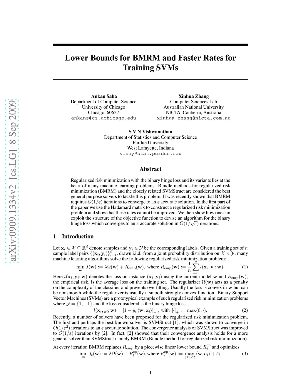 Regularized risk minimization with the binary hinge loss and its variants lies at the heart of many machine learning problems. Bundle methods for regularized risk minimization (BMRM) and the closely related SVMStruct are considered the best general purpose solvers to tackle this problem. It was recently shown that BMRM requires iterations to converge to an accurate solution. In the first part of the paper we use the Hadamard matrix to construct a regularized risk minimization problem and show that these rates cannot be improved. We then show how one can exploit the structure of the objective function to devise an algorithm for the binary hinge loss which converges to an accurate solution in iterations.