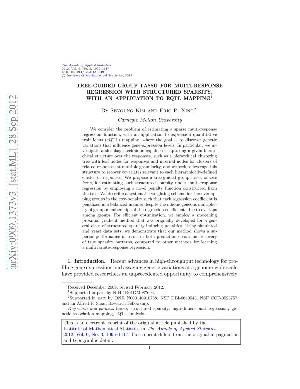 We consider the problem of estimating a sparse multi-response regression function, with an application to expression quantitative trait locus (eQTL) mapping, where the goal is to discover genetic variations that influence gene-expression levels. In particular, we investigate a shrinkage technique capable of capturing a given hierarchical structure over the responses, such as a hierarchical clustering tree with leaf nodes for responses and internal nodes for clusters of related responses at multiple granularity, and we seek to leverage this structure to recover covariates relevant to each hierarchically-defined cluster of responses. We propose a tree-guided group lasso, or tree lasso, for estimating such structured sparsity under multi-response regression by employing a novel penalty function constructed from the tree. We describe a systematic weighting scheme for the overlapping groups in the tree-penalty such that each regression coefficient is penalized in a balanced manner despite the inhomogeneous multiplicity of group memberships of the regression coefficients due to overlaps among groups. For efficient optimization, we employ a smoothing proximal gradient method that was originally developed for a general class of structured-sparsity-inducing penalties. Using simulated and yeast data sets, we demonstrate that our method shows a superior performance in terms of both prediction errors and recovery of true sparsity patterns, compared to other methods for learning a multivariate-response regression.