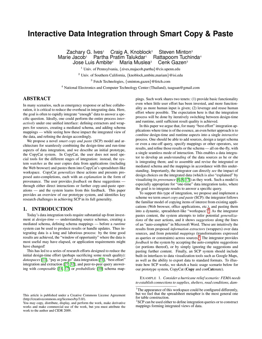 In many scenarios, such as emergency response or ad hoc collaboration, it is critical to reduce the overhead in integrating data. Ideally, one could perform the entire process interactively under one unified interface: defining extractors and wrappers for sources, creating a mediated schema, and adding schema mappings ? while seeing how these impact the integrated view of the data, and refining the design accordingly. We propose a novel smart copy and paste (SCP) model and architecture for seamlessly combining the design-time and run-time aspects of data integration, and we describe an initial prototype, the CopyCat system. In CopyCat, the user does not need special tools for the different stages of integration: instead, the system watches as the user copies data from applications (including the Web browser) and pastes them into CopyCat?s spreadsheet-like workspace. CopyCat generalizes these actions and presents proposed auto-completions, each with an explanation in the form of provenance. The user provides feedback on these suggestions ? through either direct interactions or further copy-and-paste operations ? and the system learns from this feedback. This paper provides an overview of our prototype system, and identifies key research challenges in achieving SCP in its full generality.