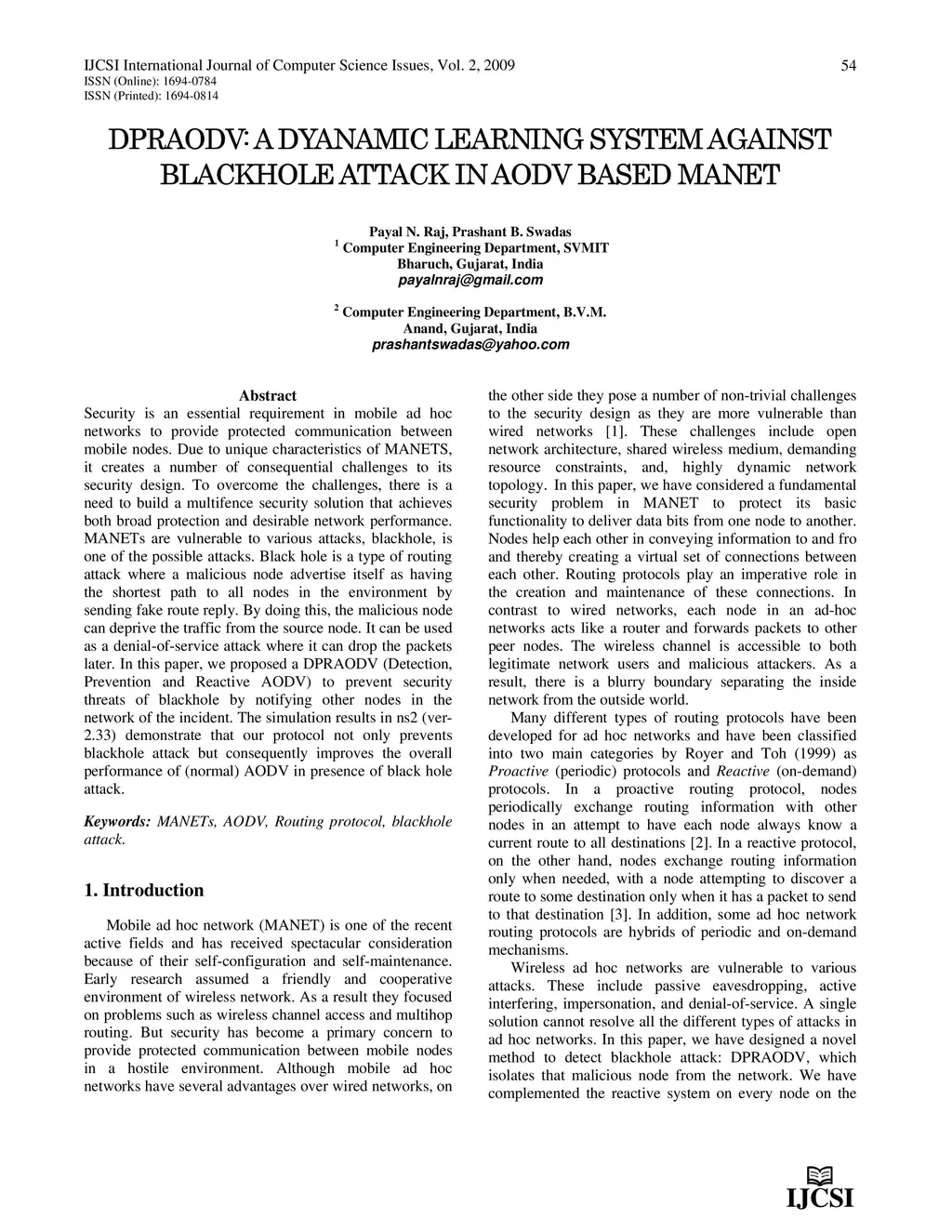 Dpraodv: A Dyanamic Learning System Against Blackhole Attack in Aodv